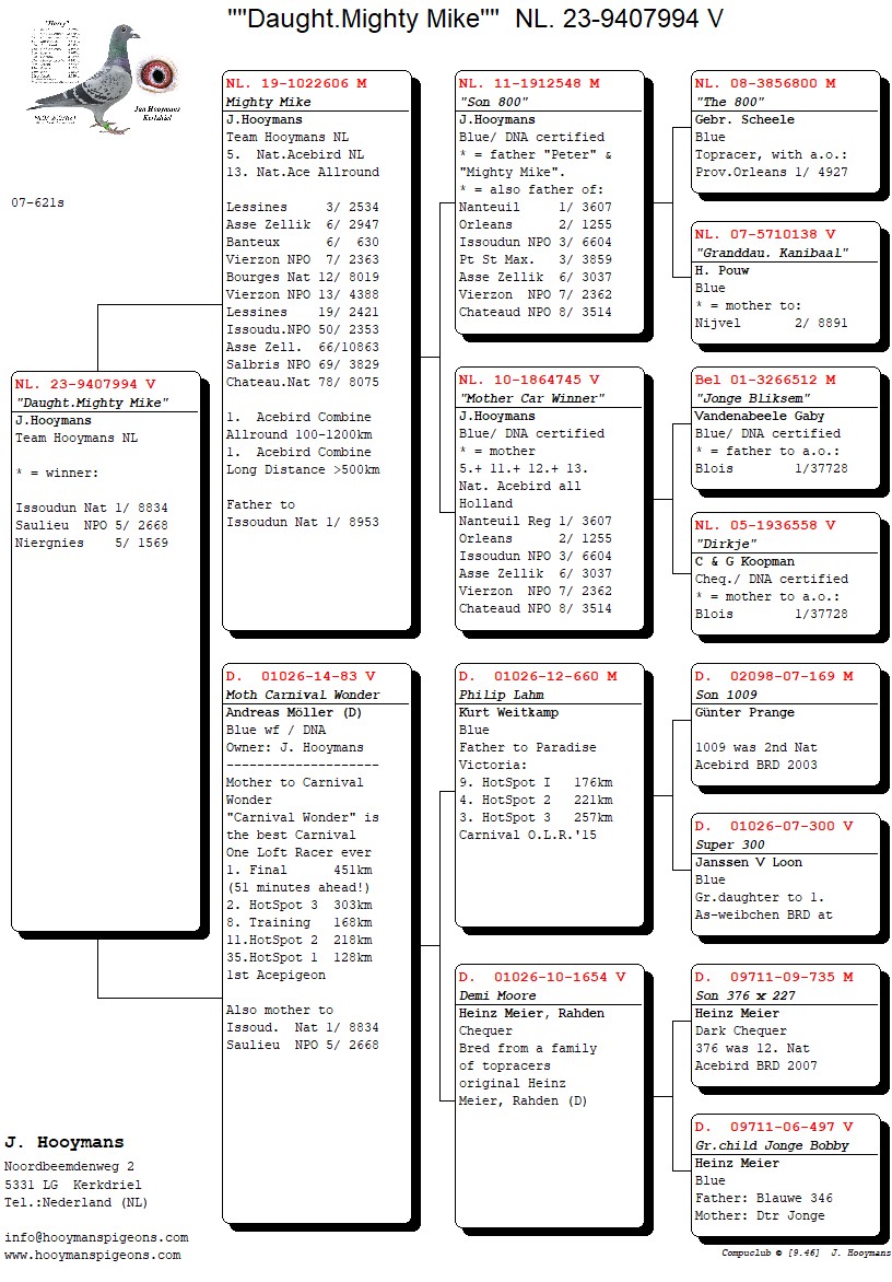 Op het hok bij ons in Kerkdriel was de eerste duif de NL23-9407943, een duivin. Zij wint nu de 13e Nationaal SIII Issoudun. Haar vader komt uit Golden Prince met Olympic Magnum, een samenzetting van twee superduiven. De moeder eveneens, uit “Peter x 118”. “118” was een puike vliegster met o.a. 8e Bourges van 16.658 duiven en ze is o.a. moeder van “Love”. De “Peter” idemdito, klasse vlieger en vader van “Gregory” (1e Nat. Libourne KBDB). De “Peter” is ook een volle broer van “Mighty MIke”, de vader van de 1e prijswinnares.