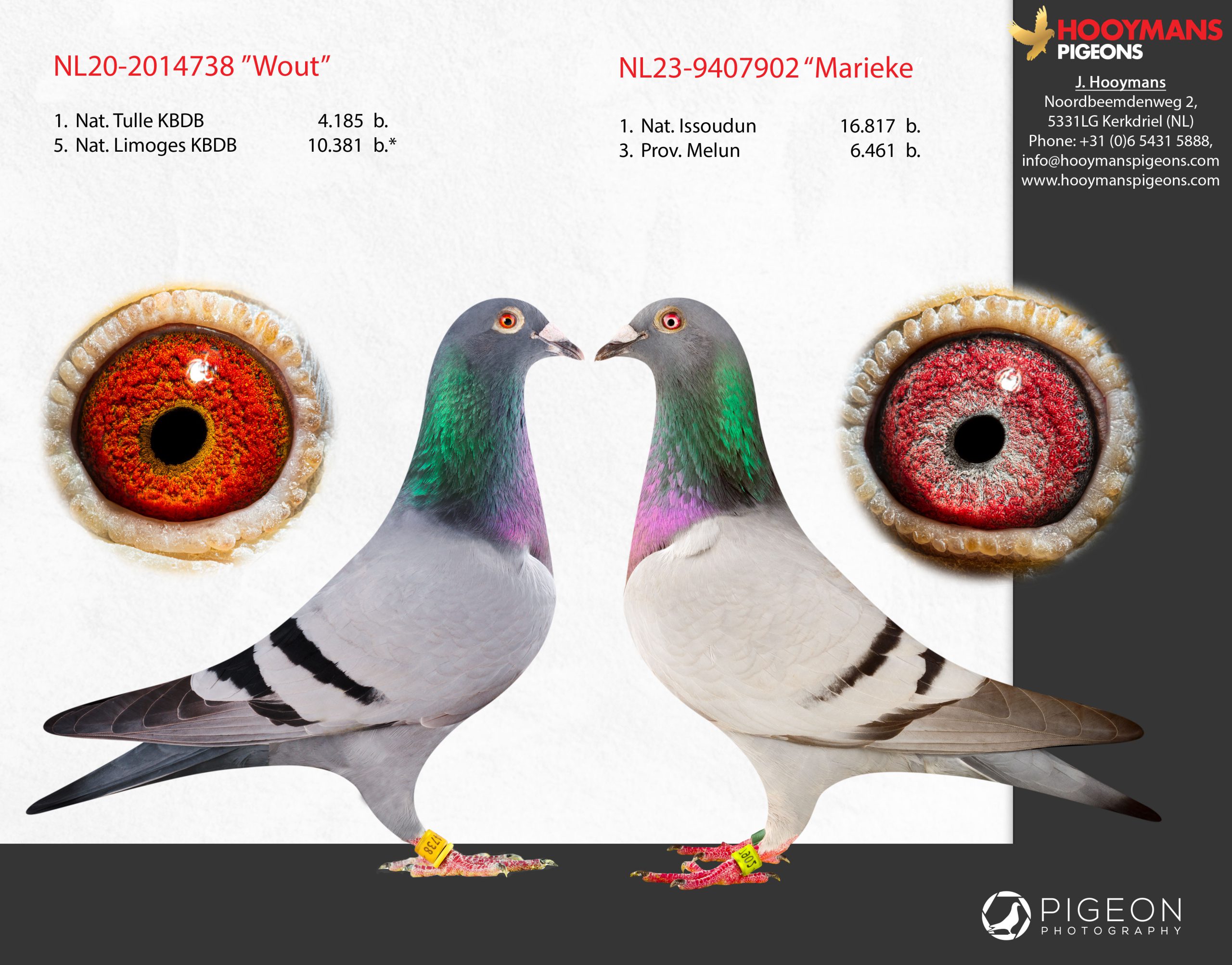 Alle messen worden weer geslepen voor het nieuwe vliegseizoen, waarbij de focus ligt op het winnen van mooie concoursen. Afgelopen jaar wonnen we in Nederland het hoogst haalbare met Christian – Team Hooymans NL namelijk de 1e Nationaal Issoudun van 16.803 Nederlandse duiven met “Marieke”. Zij was de snelste van het enigste totale konvooi op de dagfondvluchten. Na haar super prestatie is ze uiteraard verhuisd naar ons kweekhok. Ze vloog als jaarling ook al een 3e provinciaal Melun van meer dan 6.000 duiven en stond op moment van haar prestatie ook bij de regionale asduiven en heeft zich dus volop bewezen. Met zulk kaliber wilde Christian geen risico meer nemen en veiligstellen voor het kweekhok.