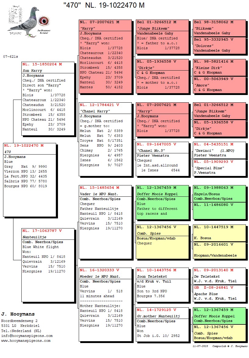 De moeder van de “561” is een bewezen dochter van “New Harry x Hilde”. Dit is de enige duivin die uit deze super koppeling geboren is. Hilde was 1 van de best kwekende zussen van de Harry. Onder andere ook met “New Witbuik” gaf ze goede nakomelingen op marathon vluchten!