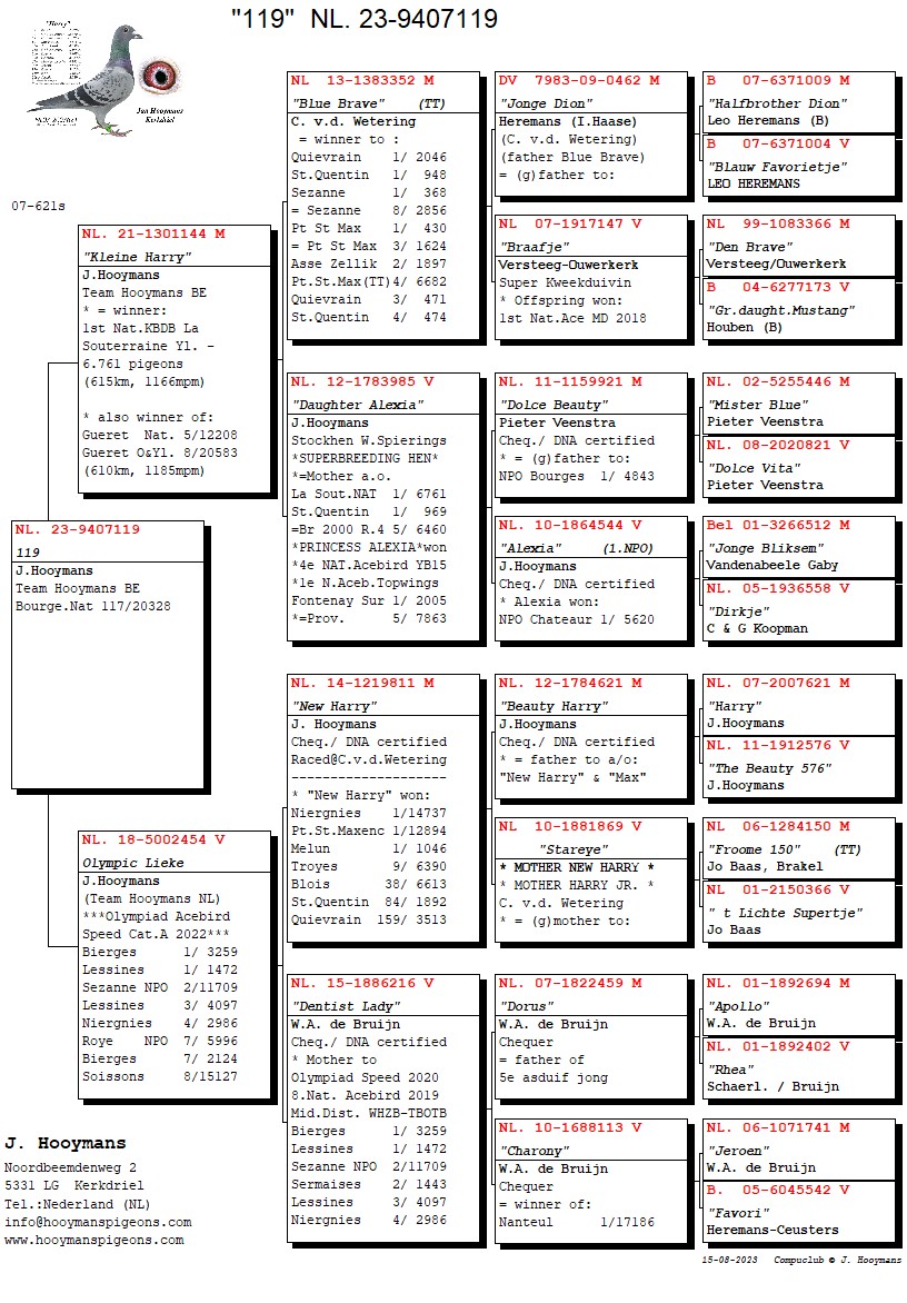 De 3e duif, 119/23 op zijn beurt is een directe zoon van “Kleine Harry” zelf, en was toen gekoppeld aan 1 van onze allerbeste duivinnen namelijk “Olympic Lieke”.