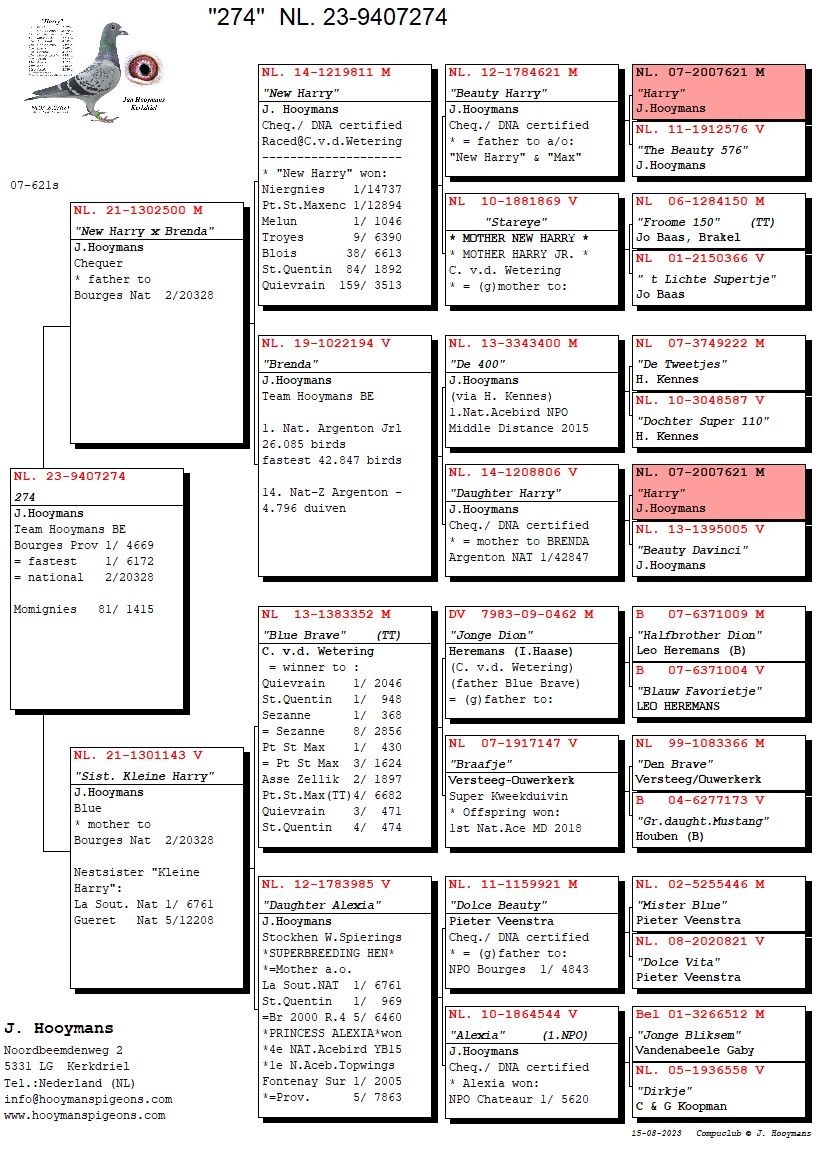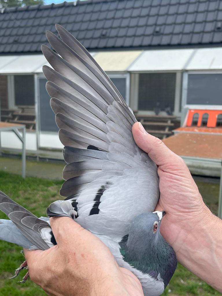De eerste duif heeft een weergaloze afstamming. Vader komt direct uit “New Harry” gekoppeld aan “Brenda”, die in 2020 de 1e Nationaal Argenton (snelste van ruim 40.000 duiven) wist te winnen voor Team Hooymans BE. De moeder is de nestzus van “Kleine Harry”, die vorig jaar de duivenwereld verbaasde door met kopwind de 1e Nationaal La Souterraine te winnen bij Gregory, op 1 van de verste afstanden van BelgiĆ« en alle kopduiven in het westen van het land. Deze nestzus ging vorig jaar reeds terug naar het kweekhok nadat ze gewond raakte bij een aanval van de slechtvalk bij Team Hooymans BE. In haar eerste jaar op de kweek geeft ze nu direct de 2e Nationaal Bourges. Hieronder de foto’s en afstamming van de 2e Nationaal winnaar “274”. Op onze Facebook/Instagram vindt u een filmpje van deze prachtige duif.