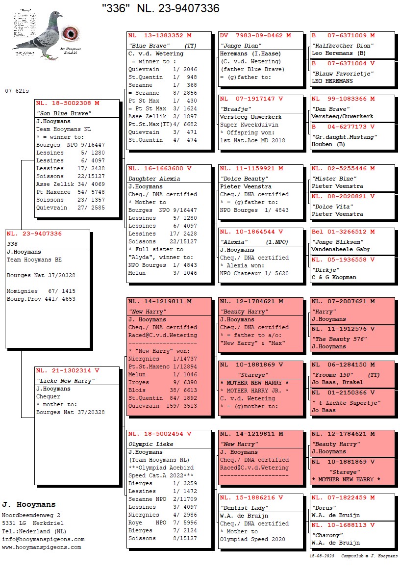 De 2e en 3e duif zijn eveneens nauw aan de 1e duif verwant. De 2e duif was de 336/23, uit de 308/18, zelf een super vlieger en zoon van Blue Brave, (zelfde genenpakket als Kleine Harry) en de moeder is een inteelt-product uit New Harry x zijn superdochter Olympic Lieke.