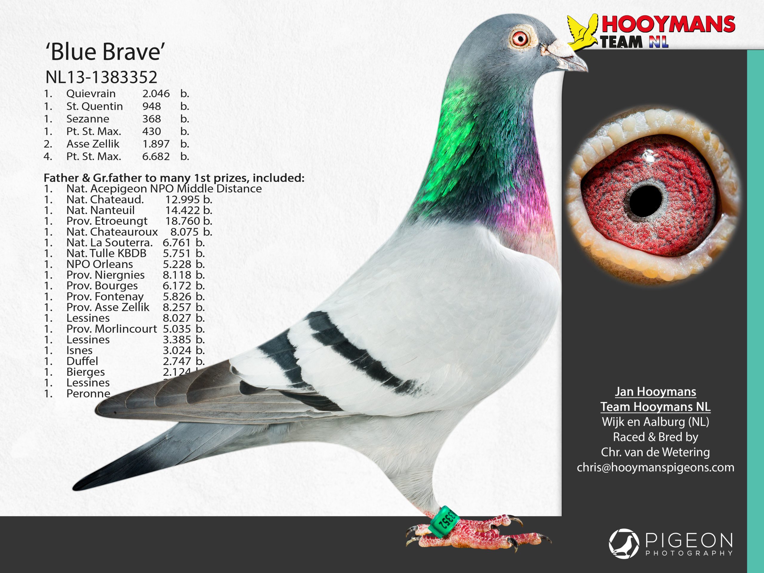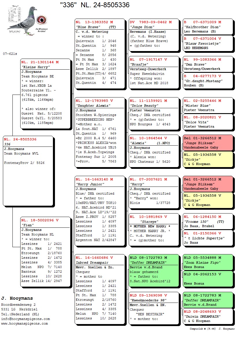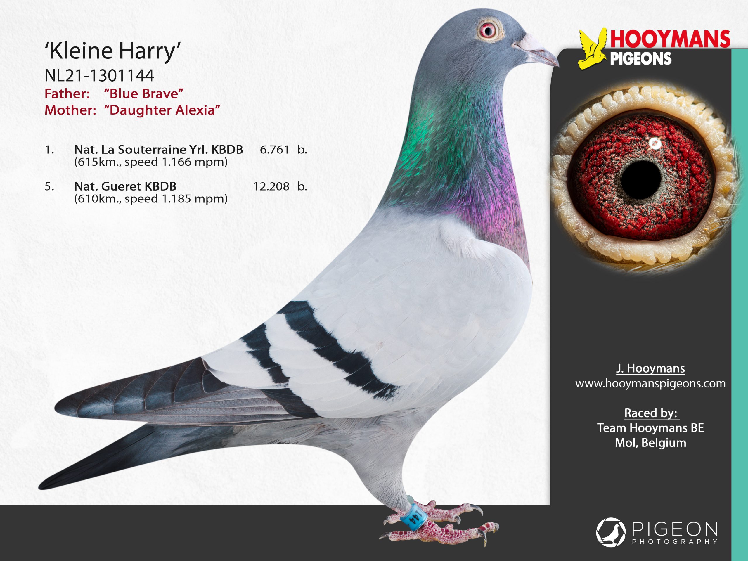 De tweede duif komt rechtstreeks uit fenomeen “Kleine Harry” (1e en 6e Nationaal KBDB en eveneens zoon Blue Brave) met topduivin “Fien”, die enkele seizoenen super vloog bij Team Hooymans NL.