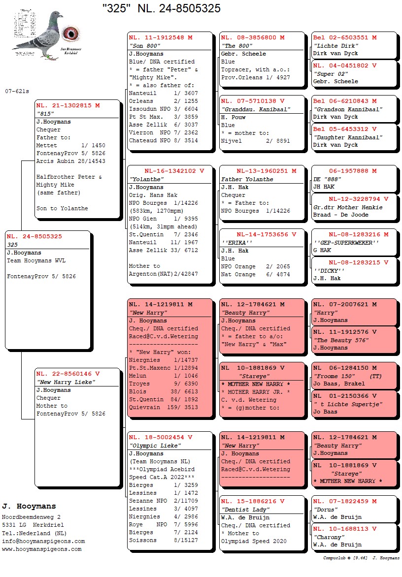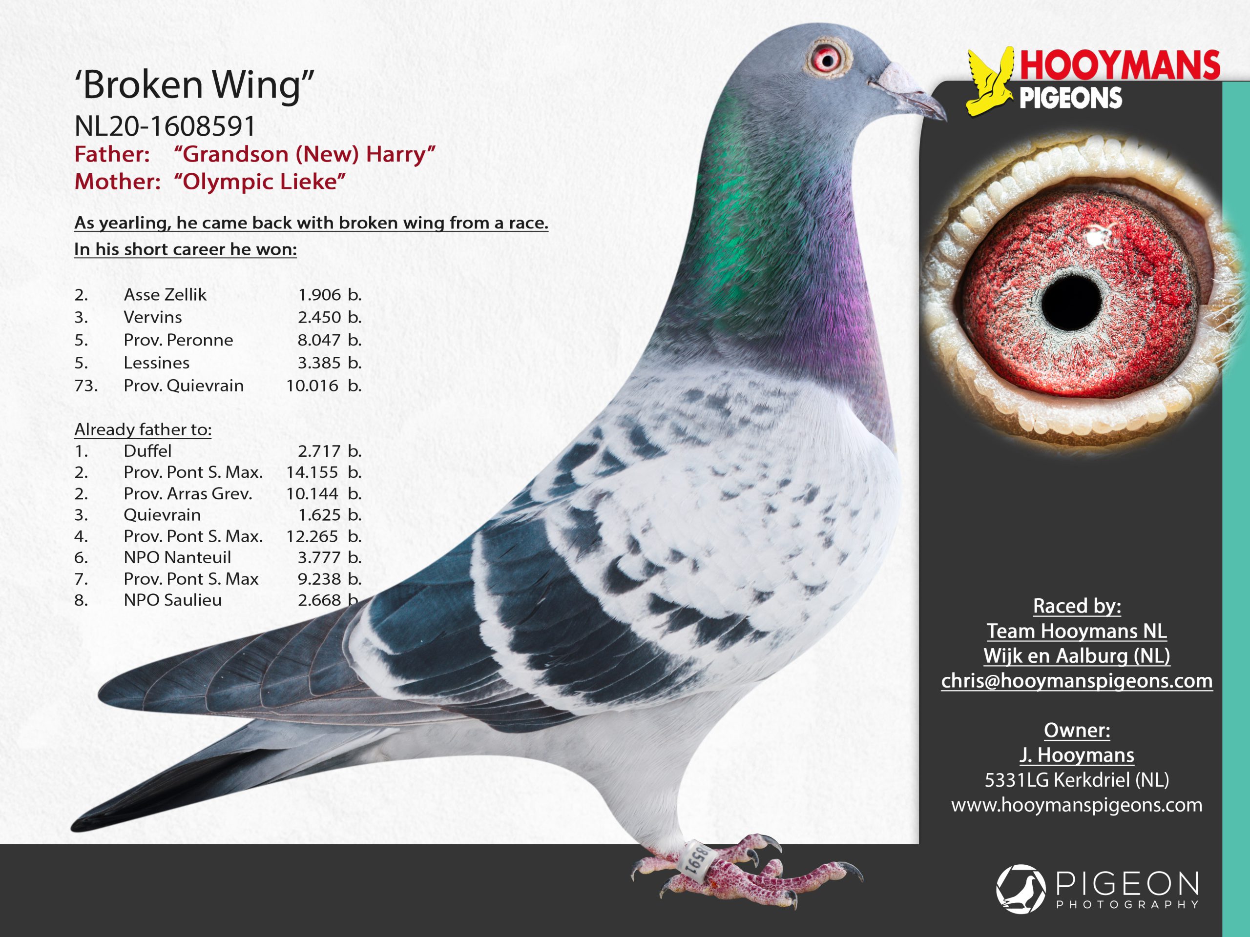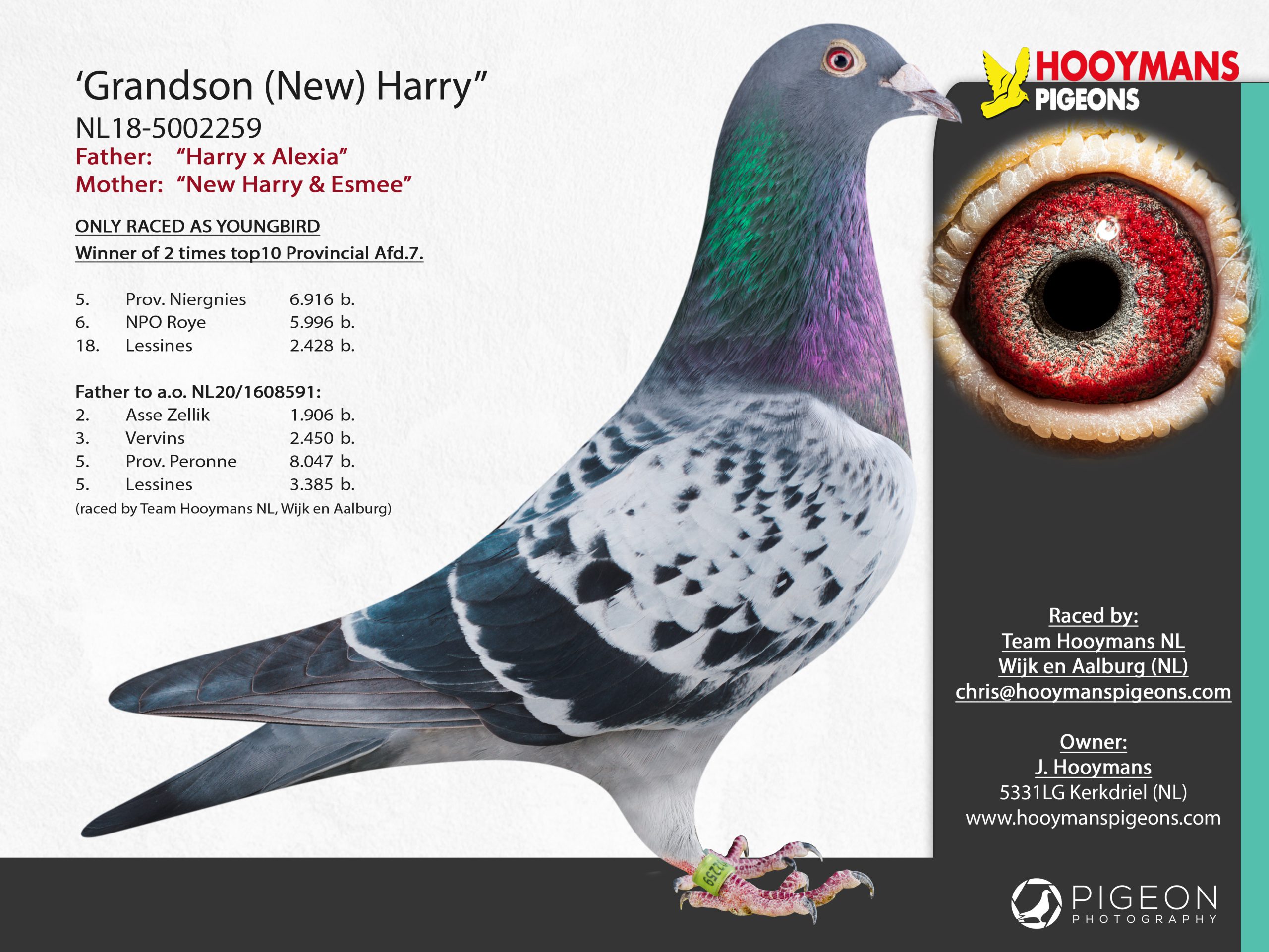 De tweede duif komt rechtstreeks uit fenomeen “Kleine Harry” (1e en 6e Nationaal KBDB en eveneens zoon Blue Brave) met topduivin “Fien”, die enkele seizoenen super vloog bij Team Hooymans NL.