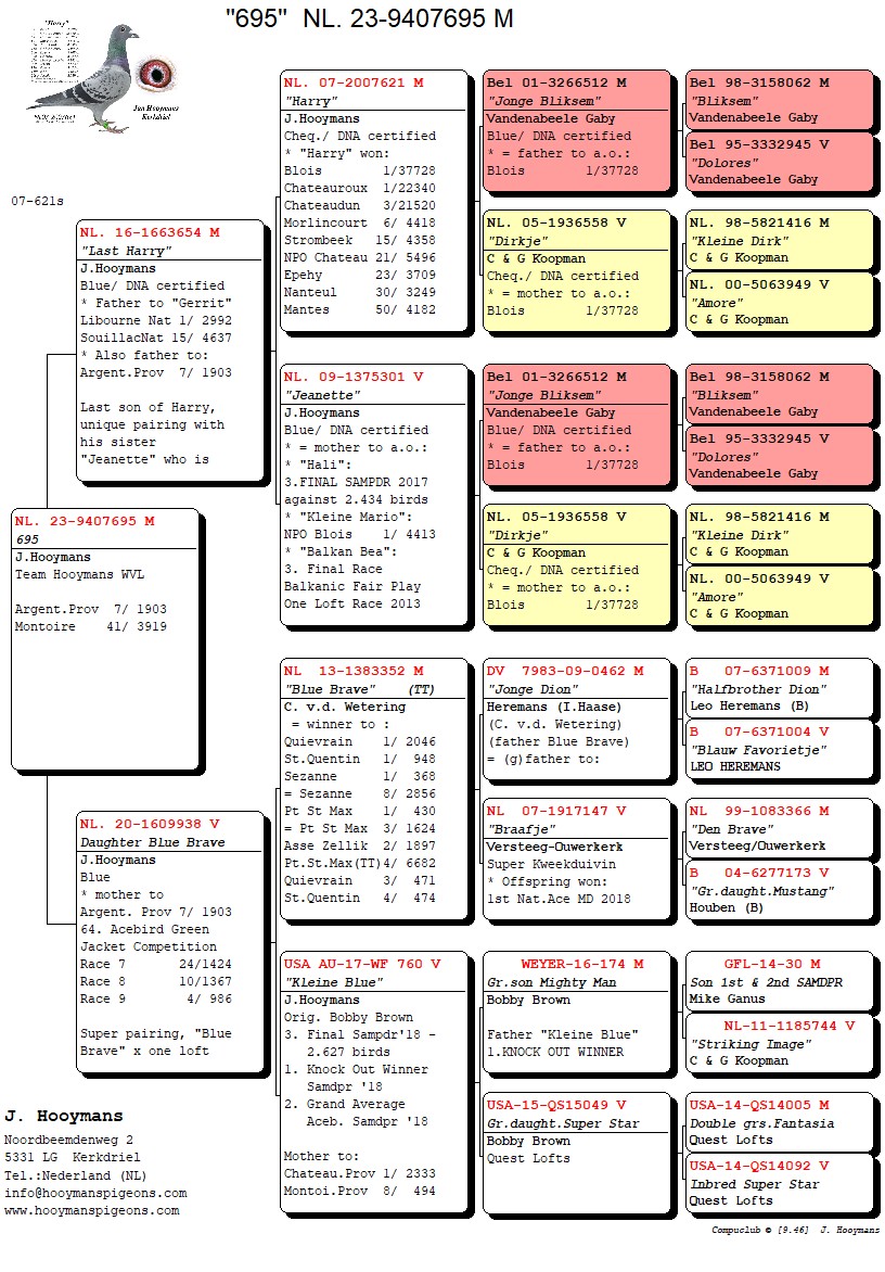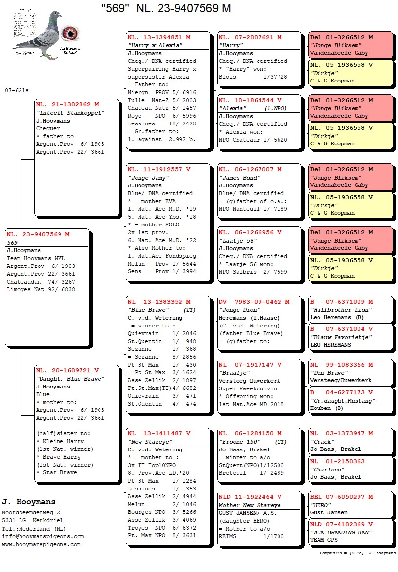 De eerste duif was NL23/569, een doffer. Aan vaderszijde volledig ingeteelt naar het stamkoppel, aan moederszijde opnieuw uit “Blue Brave”. De tweede duif was NL23/695, aan vaderszijde opnieuw inteelt stamkoppel (uit vader van Nationale winnaar Gerrit) en aan moederszijde uit “Blue Brave”. De derde duif is uit superkoppel “Carlo x Magic Lady 825”. De vierde duif is broer “Anja”, 1e Nationaal Tulle, uit “Silviu” x opnieuw dochter “Blue Brave en Dentist Lady”.