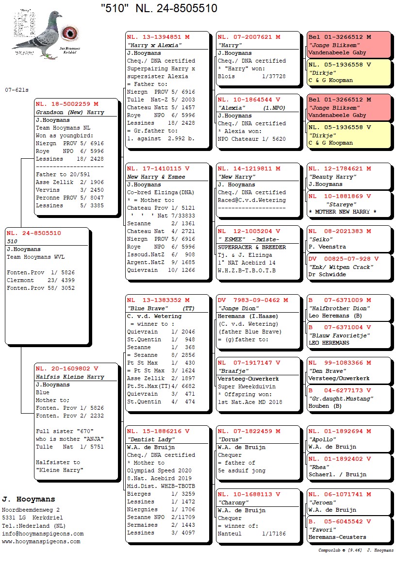 De eerste duif, NL24/510, liet zich eerder al 2x mooi voorin de uitslag zien en wint nu de 1e provinciaal. Vader was zelf een goede vlieger en is vader van “Broken Wing” (zelf super vlieger en op zijn beurt vader van de wereldduivin “616” die bij Team Hooymans NL dit seizoen reeds 4x in de top10 van de afdeling vliegt) Moeder is een dochter “Blue Brave” en “Dentist Lady” en dit maakt haar dus een volle zus van de moeder van “Anja”, welke bij Hooymans WVL enkele weken geleden nog de 1e Nationaal Tulle Jaarlingen tegen 5.751 duiven wist te pakken.