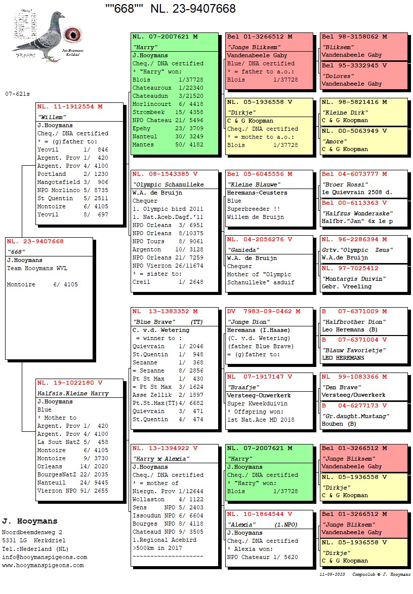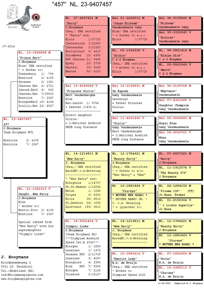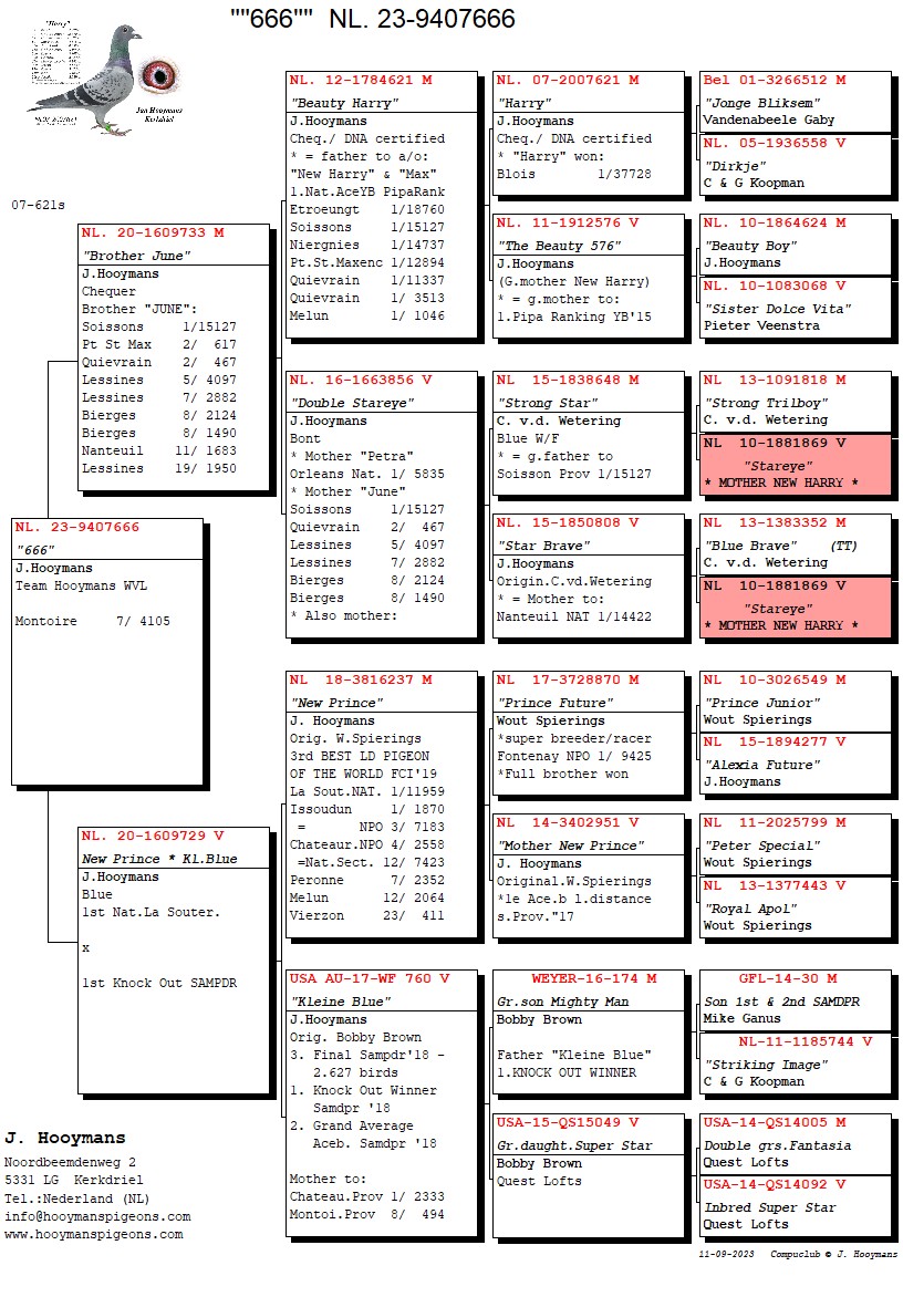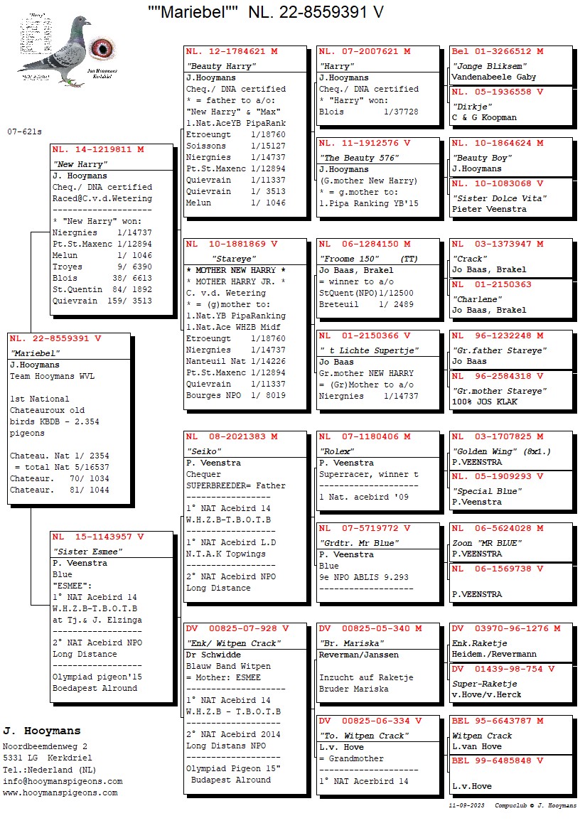 De winnende duif is de NL22-8559391, een geschelpt duivinnetje, klein compact en zeer gespierd. Ze is een dochter van niemand minder dan de absolute topkweker van dit moment: “New Harry”. De moeder van de winnares is de NL15/957 en deze is een volle zus van “Esmee” van Tjeerd & Jouke Elzinga, een superduivin. De 957 is gekweekt door Pieter Veenstra en hebben we in begin 2016 als jonge duif aangeschaft op een online verkoop van Pieter.