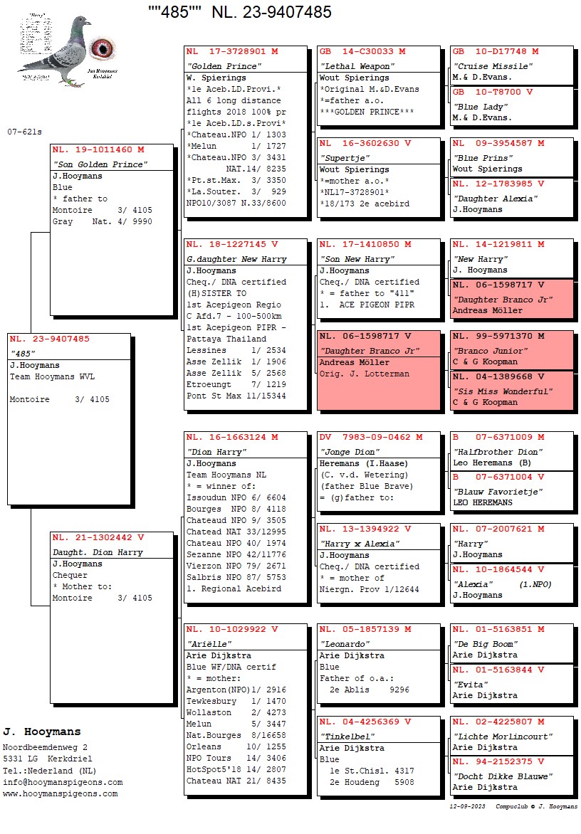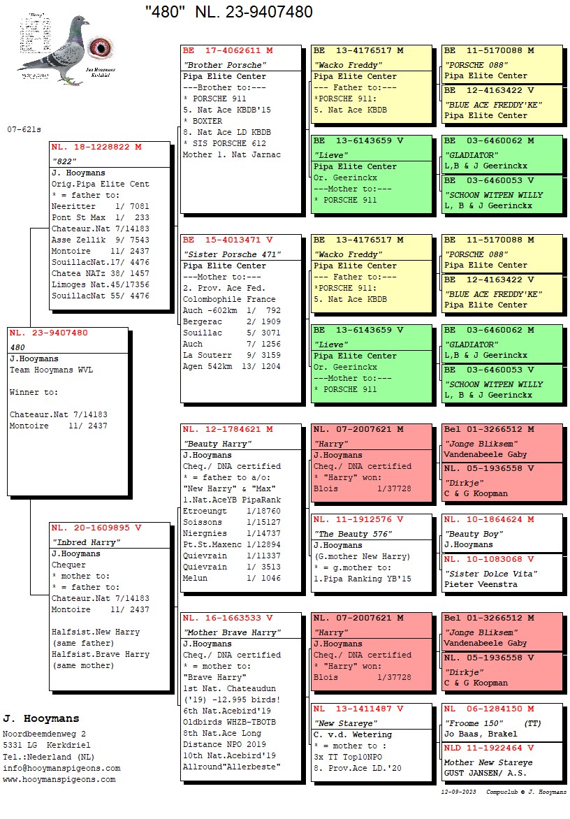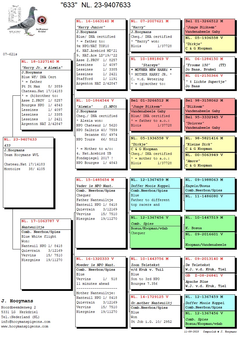 Tegen 14.183 duiven werd het: 7-17-30-34-55-56-114-enz! De eerste 2 duiven hadden beide al eerder per 100-tal gevlogen, in onze ogen beloftes voor komend seizoen. Hieronder de pedigrees van de 7e en 17e Nationaal Chateauroux tegen 14.183 jonge duiven: