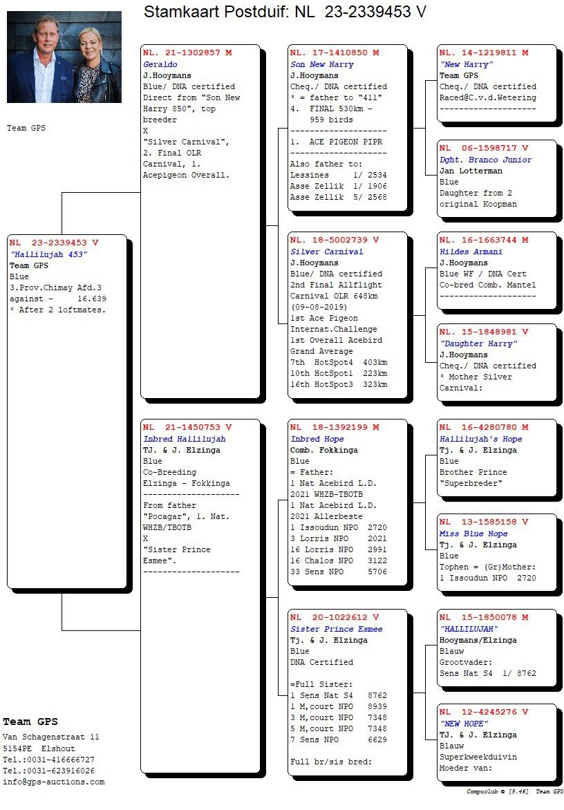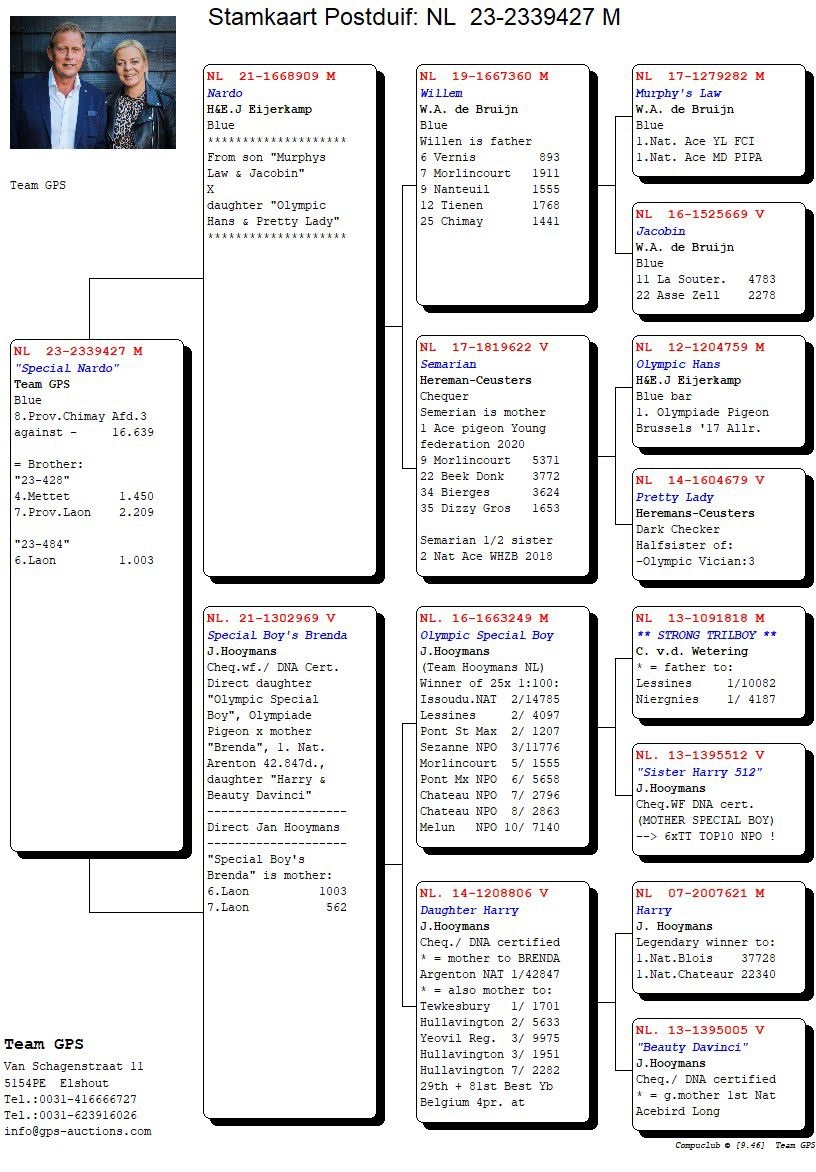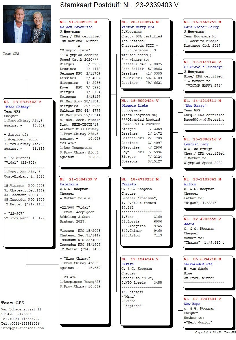 De 1e en 7e prijs winnaars van 16.639 duiven komen uit een rechtstreekse doffer van ons, uit “Victor Harry” en “Olympic Lieke”, het beste van het beste. Deze duif heeft Team GPS bemachtigd bij de Golden Ten verkoop van De Duif.
