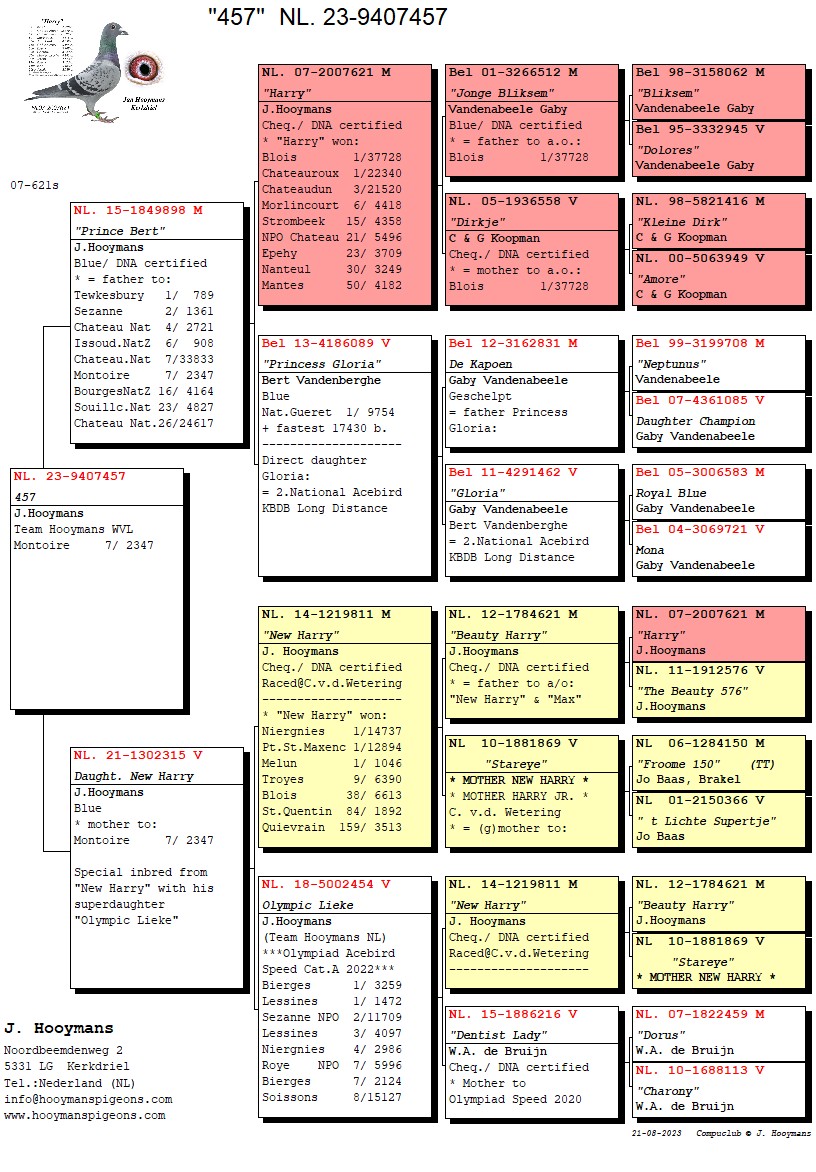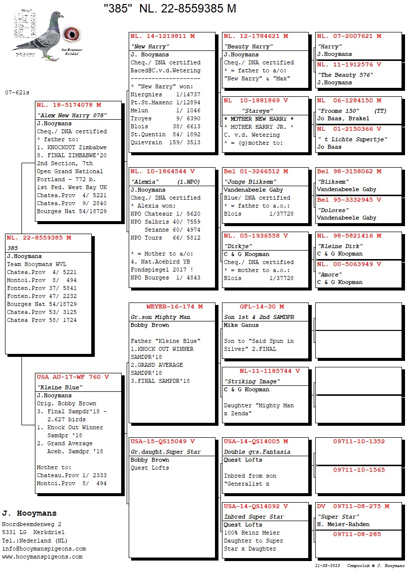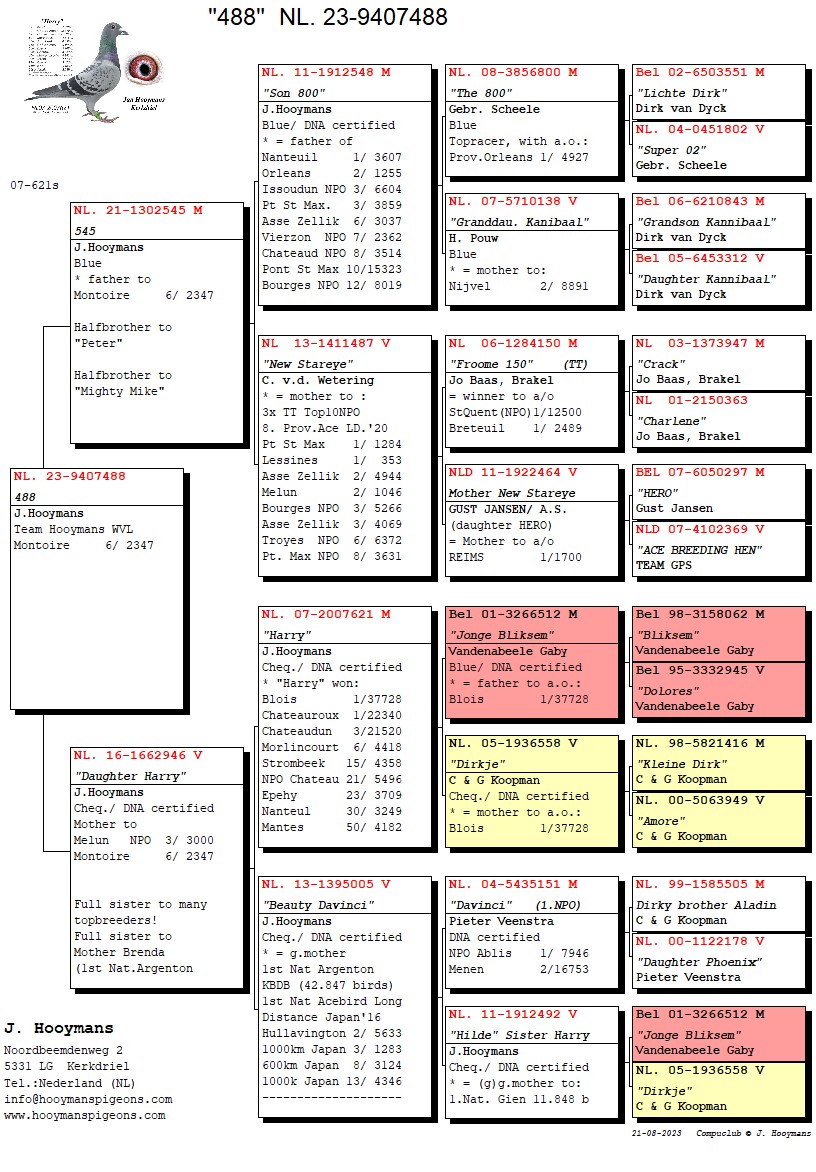 De eerste jonge duif is de 23/488 en komt uit een jong doffertje met een oudere duivin. Vader komt uit “Son 800” (vader o.a. Peter en Mighty Mike) gekoppeld aan “New Stareye”. Moeder is een directe dochter van good-old “Harry”.