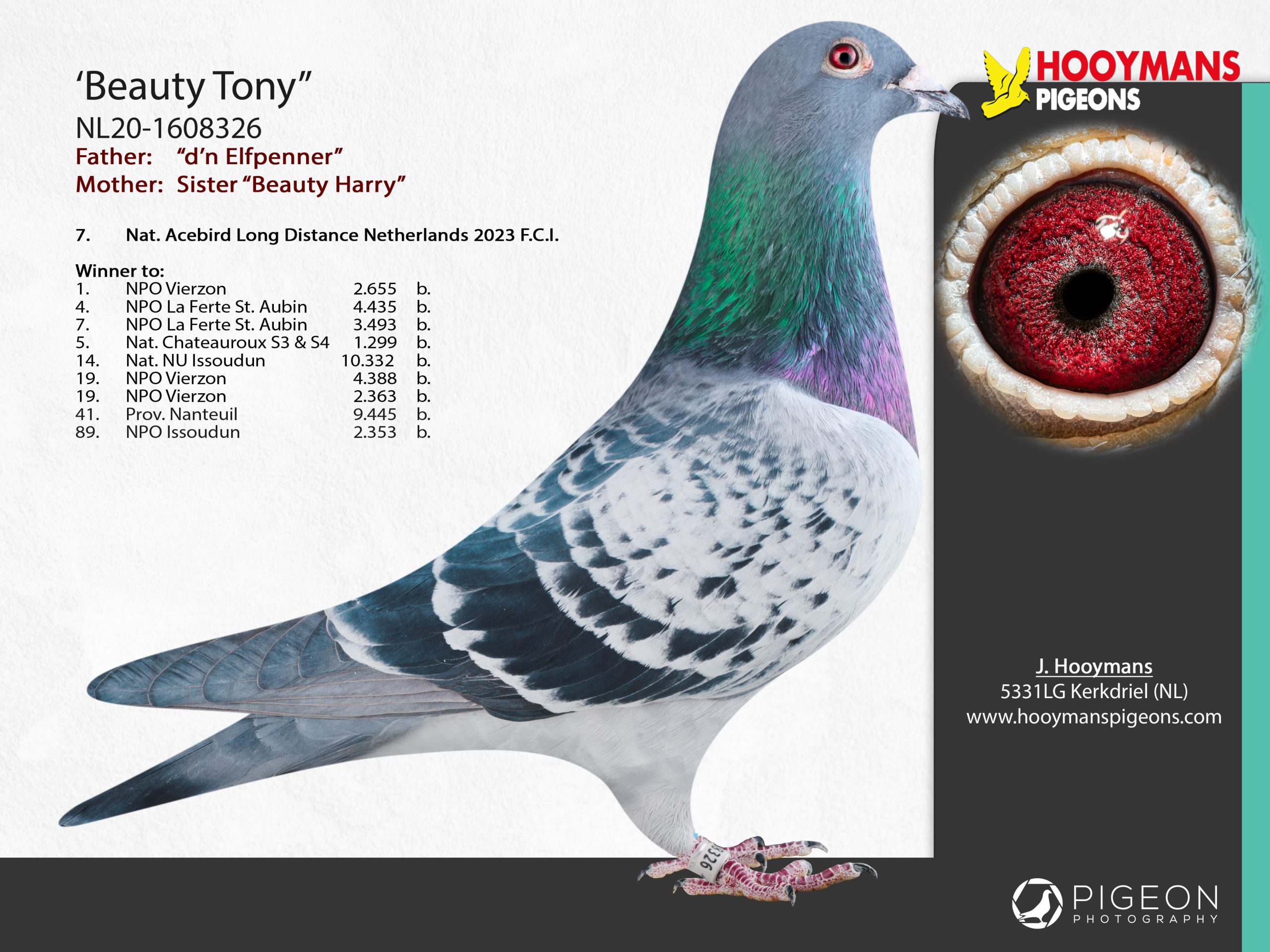 Onze beste duif op de dagfond was “Beauty Tony”, NL20-1608326. Deze schitterende doffer won vorig jaar de 1e NPO Vierzon en 4e NPO La Ferte St. Aubin en dit jaar de 5e, 7e en 12e NPO. Als jaarling won hij ook al tweemaal de 19e NPO (Vierzon). Dit seizoen staat hij 7e Olympiadeduif Dagfond van Nederland en tevens 7e Nationaal asduif Dagfond (De Allerbeste FCI). “Beauty Tony” mag nu ook zijn waarde gaan bewijzen op het kweekhok. Zie hieronder de foto en stamkaart van Beauty Tony.