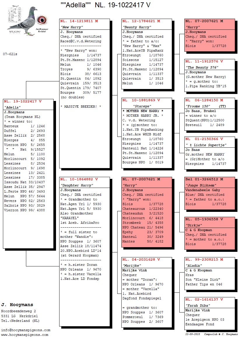 De eerste duif (5e van 1.092 duiven) is de 4-jaar oude duivin “Adella”, een fantastische dochter van New Harry die nu naar het kweekhok verhuist na jaren trouwe dienst. Ze won kopprijzen op alle vluchten en afstanden. Zie hieronder haar foto en stamkaart.