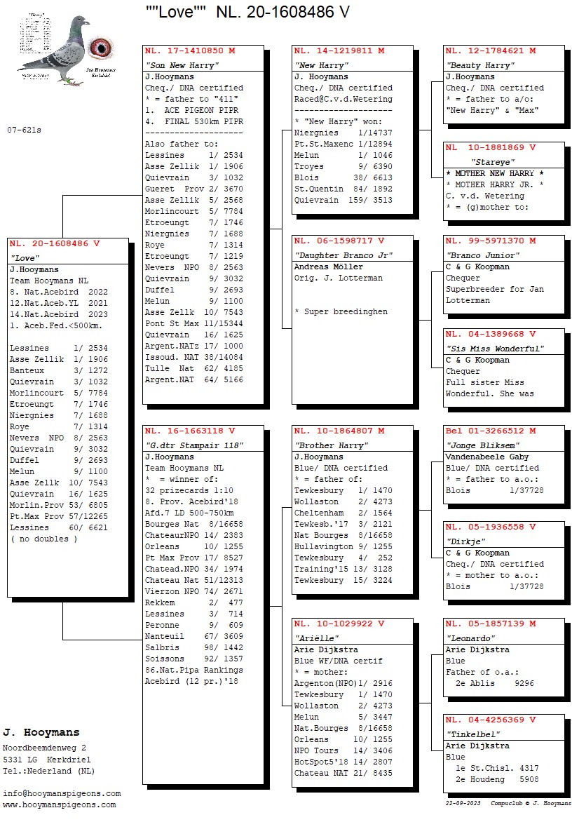 Ook zij mag nu haar waarde gaan laten zien op ons kweekhok want als je 3 jaar op rij bij de beste allround-duiven van Nederland behoort hoeft je niets meer te bewijzen ons inziens. Zie hieronder de foto en stamkaart van “Love”.