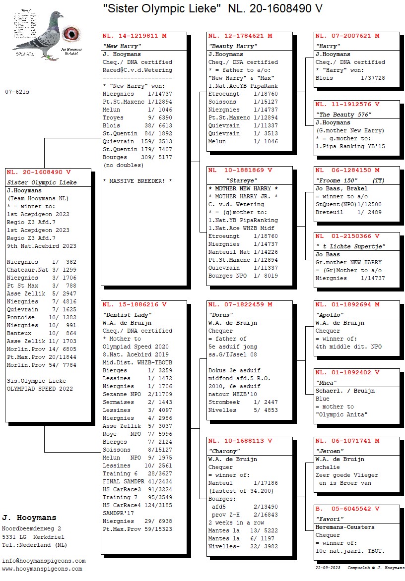 Voor het 2e jaar op rij is de 1e generaal asduif van onze regio de NL20-1608490 van Team Hooymans NL. Deze duivin, “Sister Olympic Lieke”, is een duif die zeer constant is en tevens met regelmaat een kopprijs wint. Zo won ze dit seizoen ondermeer een 3e Niergnies van 1.706 duiven, een 14e Morlincourt van 6.805 duiven en een 31e Nationaal Chateauroux van 10.456 duiven. Ook in haar vorige seizoenen wint ze prachtige kopprijzen en treedt ze in de voetsporen van haar oudere zus “Olympic Lieke”. Een volle broer werd overigens vorig jaar 5e Nationaal Asduif Jong van België bij Team Hooymans WVL. Ze mag nu, samen met haar broer en zus, haar kweekwaarde gaan bewijzen op ons kweekhok. Wat een excellente vererver blijkt “New Harry” toch steeds te zijn, en uiteraard mogen we de moeder van deze duiven, “Dentist Lady” die we van Willem de Bruijn kregen, ook niet vergeten te benoemen. Hieronder ziet u de foto en stamkaart van “Sister Olympic Lieke”.