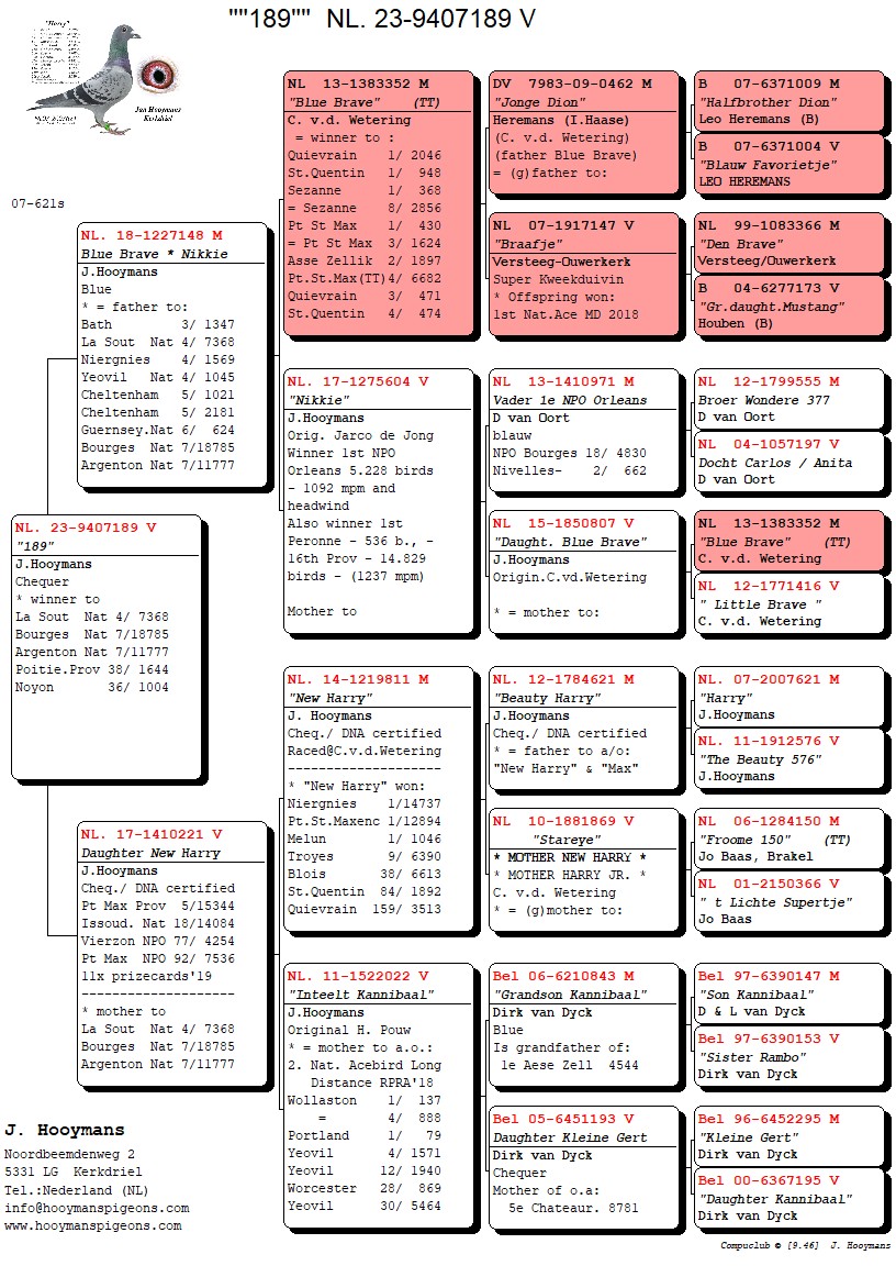 Haar vader is een blauwe doffer die we voor de kweek gehouden hebben, onbevlogen. Hij is namelijk een inteelt-product uit “Blue Brave” gekoppeld aan zijn kleindochter “Nikkie” (1e NPO Orleans). Haar moeder is een geschelpte duivin rechtstreeks uit New Harry en zij vloog bij ons in Kerkdriel enkele malen vroeg in de uitslag. Haar moeder is volledig het soort van wijlen Dirk van Dyck.