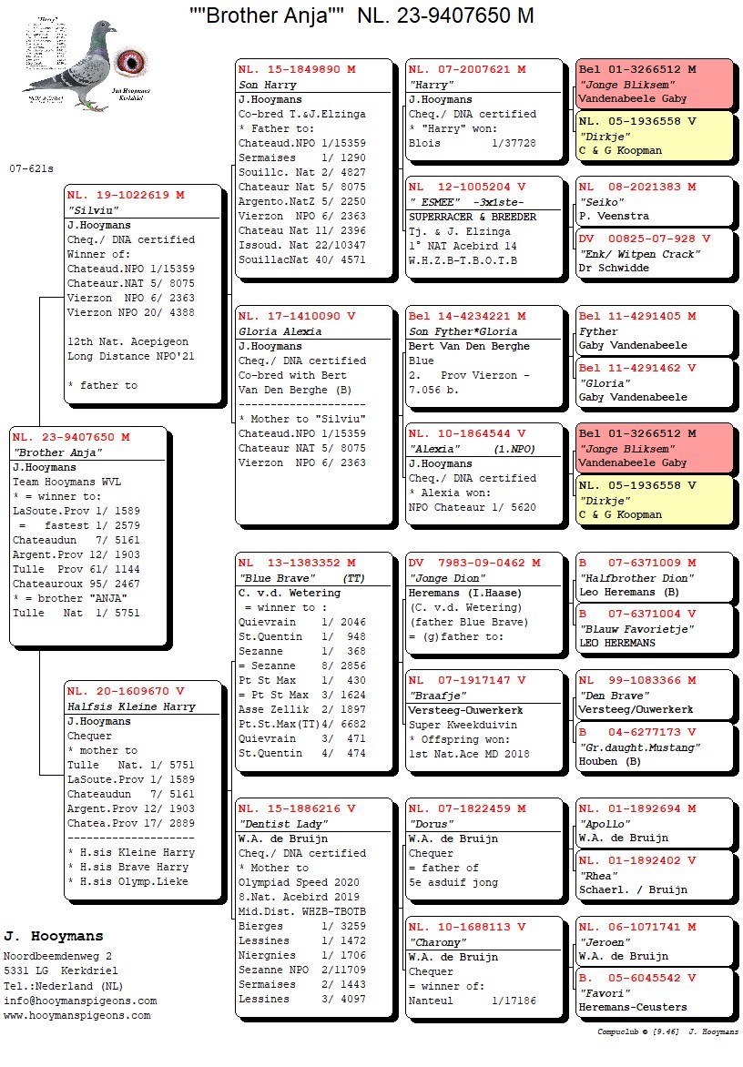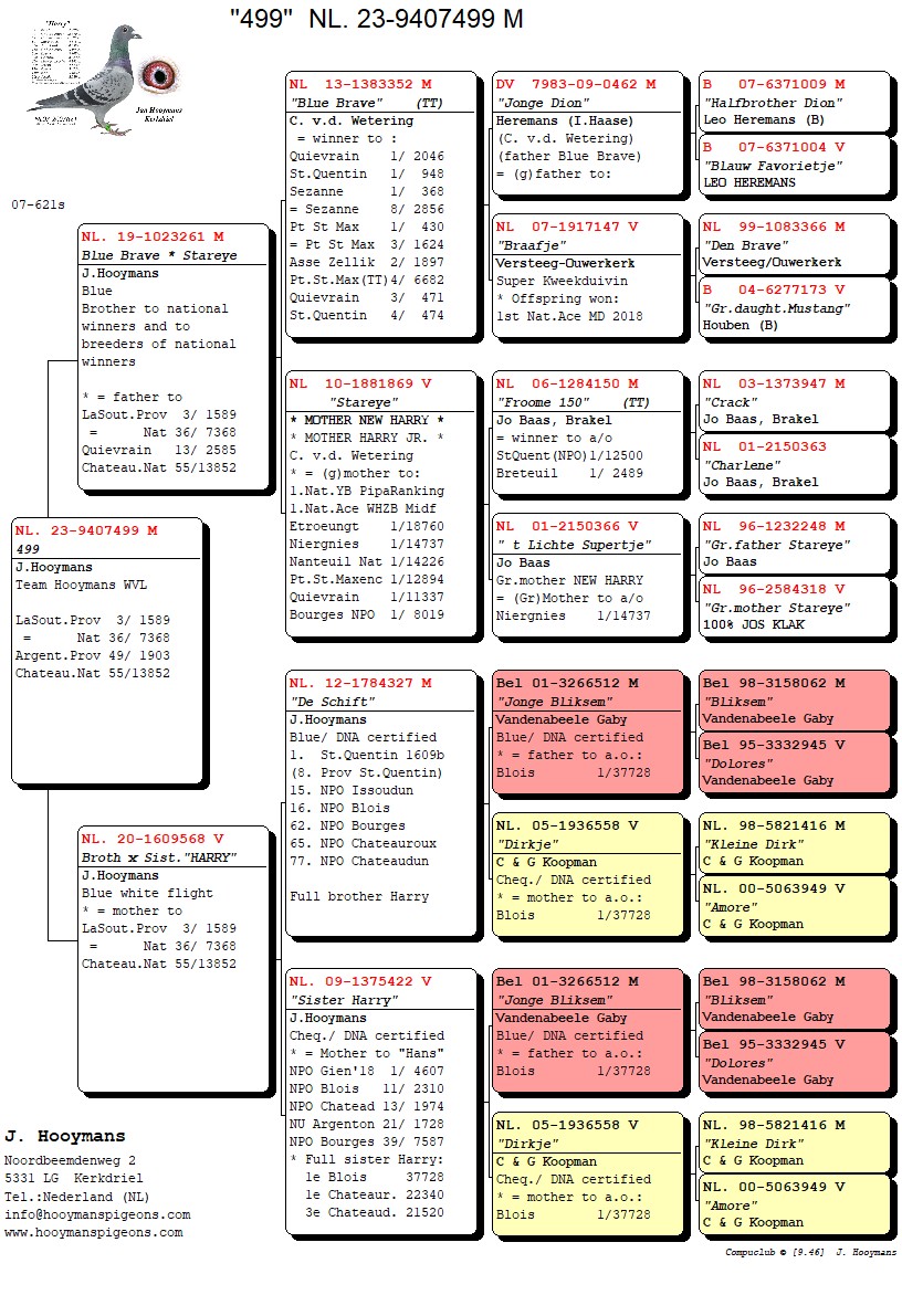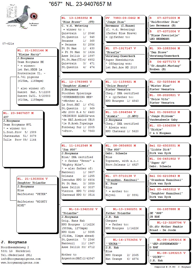 De tweede duif was NL23/499, eveneens een doffer en kleinzoon “Blue Brave” en broer en zus Harry. De derde duif was NL23/657, eveneens een doffer en directe zoon van “Kleine Harry” met halfzus “Peter” en “Mighty Mike”.