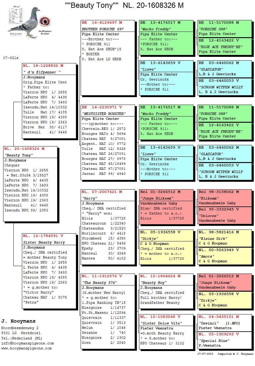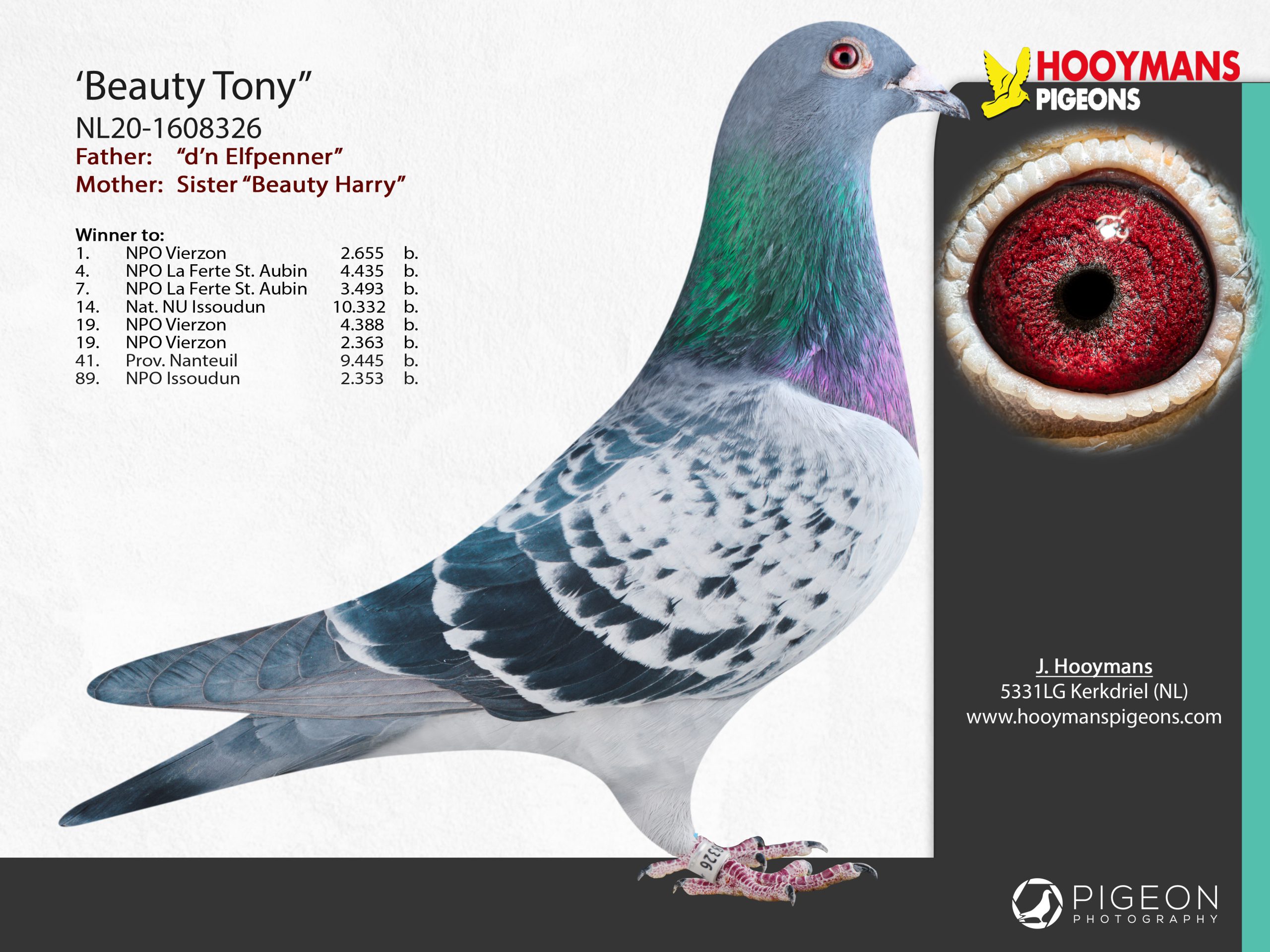 Zoals vermeld onze 1e duif was “Beauty Tony”, welke eerder een 1e, 4e en 7e NPO wint op de dagfond. Hij wint nu de 12e NPO, tevens 14e van de N.U. Zijn vader is “d’n Elfpenner” en komt van het Pipa Elite Center en zijn moeder is een volle zus van Beauty Harry, dus direct uit Harry.