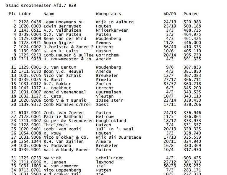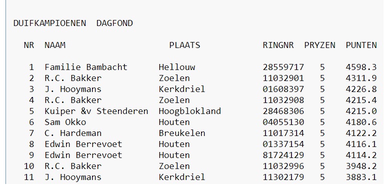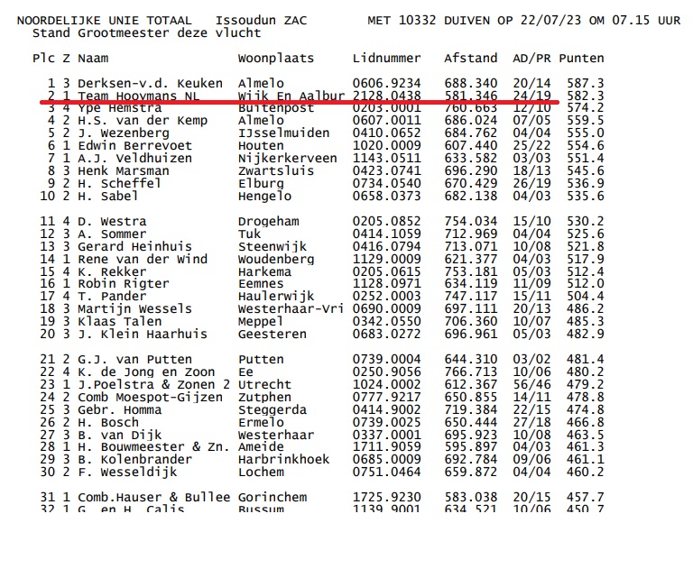Team Hooymans NL werd 1e Grootmeester van de Afdeling en 2e van de Noordelijke Unie. Op de dagfond was dit de 2e maal voor Team Hooymans NL dat de titel 1e Grootmeester van de Afdeling behaald werd. In de Noordelijke Unie tegen 10.332 duiven werd het: 25-117-123-173-205-. Maar liefst 16 van de 24 ingekorfde duiven wint 1:10 en 19 van de 24 winnen prijs.