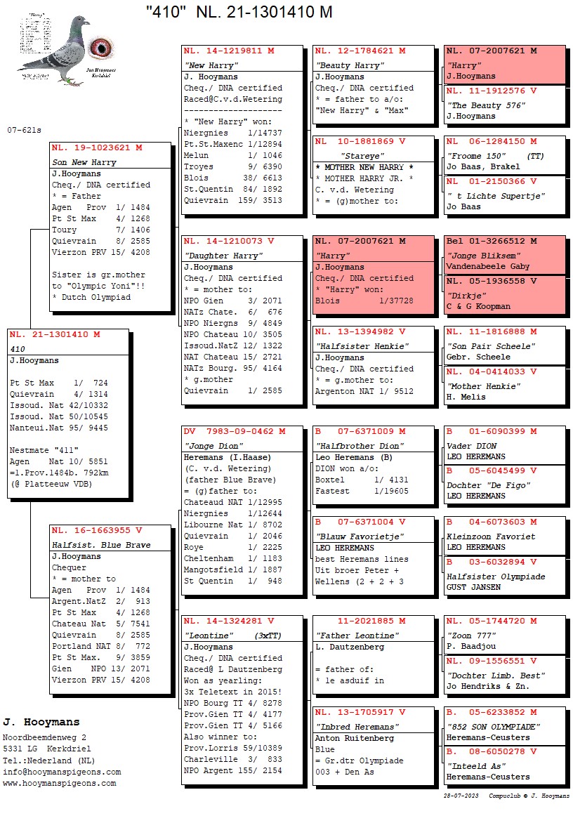 Onze tweede duif is de NL21/410, kleinzoon “New Harry” . Tevens nestmaat 411, 1e Provinciaal Agen enkele weken terug tegen 1.484 duiven bij Team Platteeuw VDB