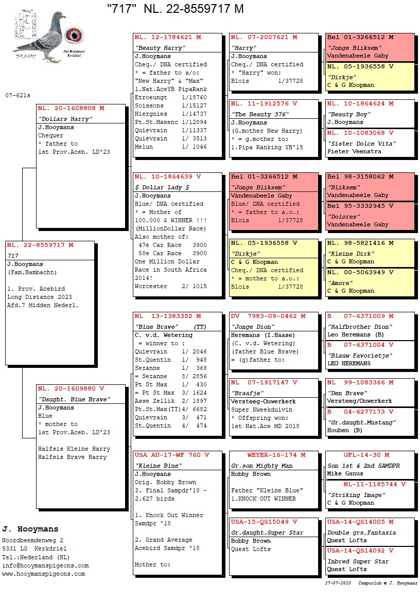 Familie Bambacht uit Hellouw hebben een goed seizoen gevlogen op de dagfond. Was het in het begin de jaarling 689 (Kleinzoon New Harry) die drie keer kop vloog, uiteindelijk werd het de jaarling 717 die met het provinciaal duifkampioenschap ervandoor gaat. Knap voor een jaarling om zo constant te presteren, viermaal ruim binnen de top100 NPO en eenmaal nipt buiten de top100 NPO. Zijn ouders zaten vorig jaar voor het eerst op ons kweekhok, geboren in najaar 2020. In 2021 laten we deze duiven uitruien en uitgroeien om ze dan in 2022 te koppelen. Wij kweken dus altijd pas met duiven die qua ring 2 jaar oud zijn. Een van hun eerste kinderen was dus de NL22-8559717 die als eitje naar Familie Bambacht verhuisde. Vader van de 717 is een halfbroer van New Harry, direct uit Beauty Harry en Dollar Lady (zus Harry). Moeder van de 717 is een halfzus van de Kleine Harry en Brave Harry, direct uit Blue Brave en de super OLR-duivin Kleine Blue.