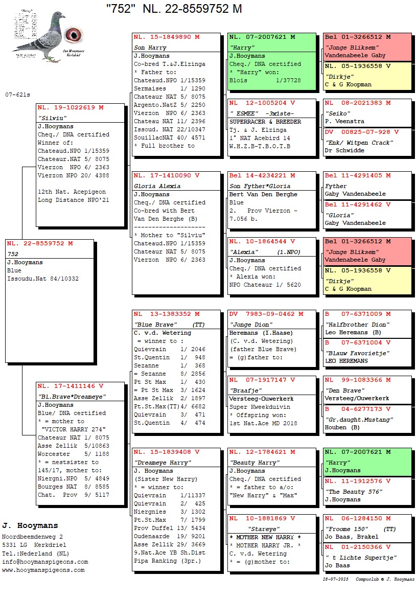 Onze derde duif is jaarling NL22/752 en deze komt uit Silviu x halfzus Kleine Harry (uit Blue Brave x Dreameye Harry) en die is ook moeder van Victor Harry 1e Nationaal Chateauroux in 2021.
