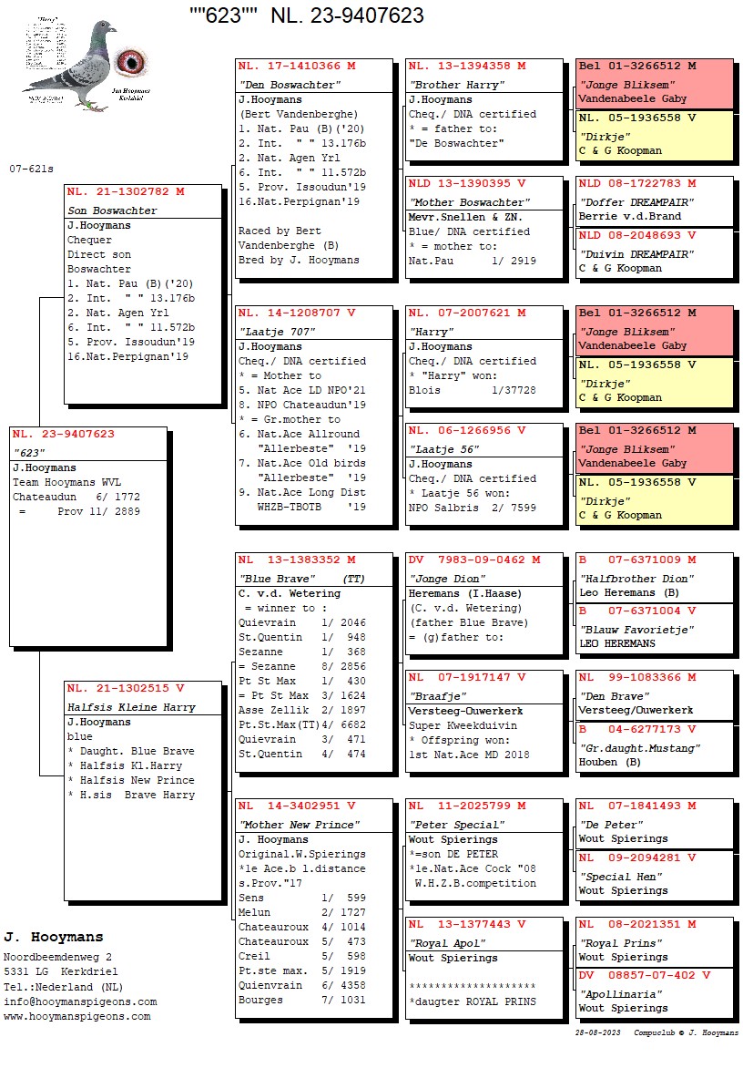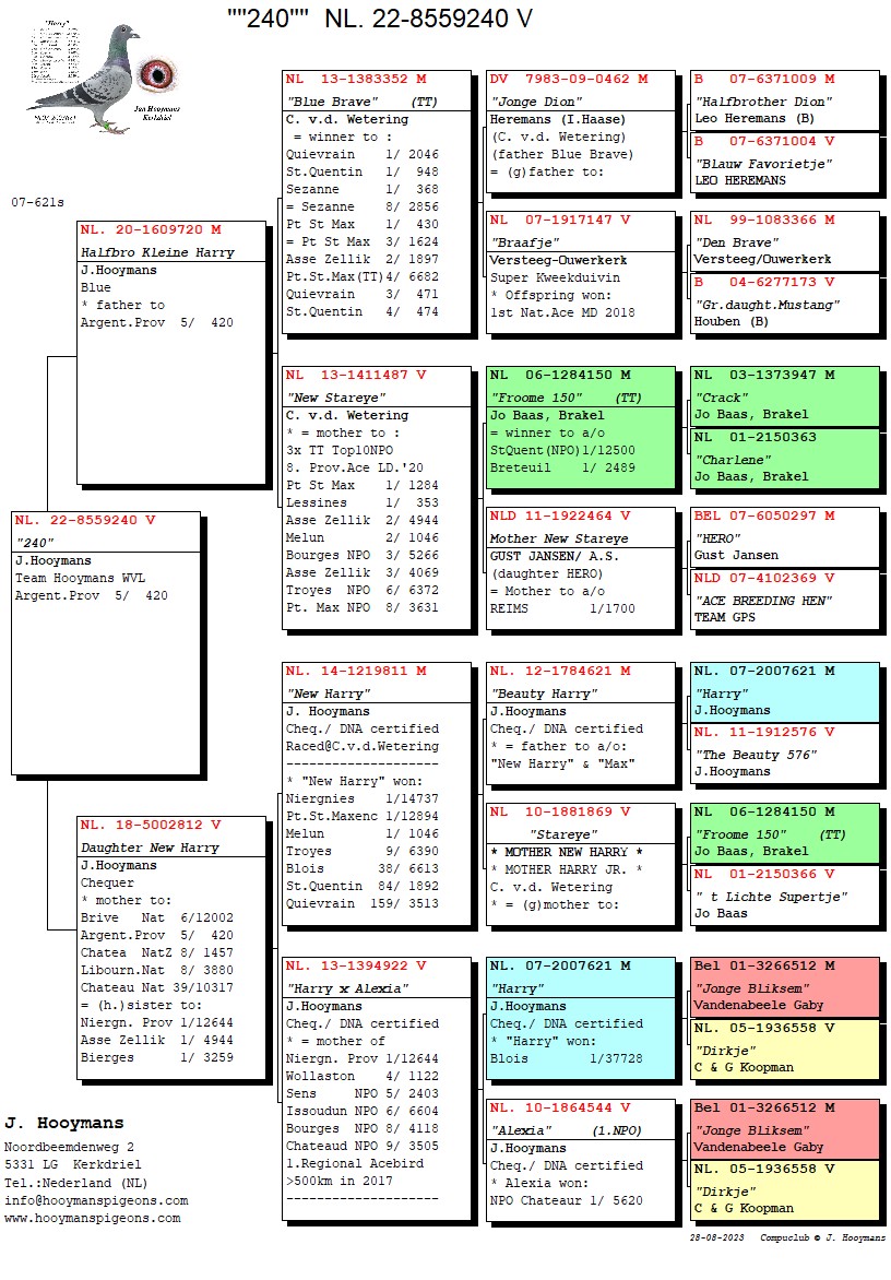 Het waren 3 duivinnen die het spits afbeten, 2 jaarlingen en 1 oude. De eerste duif (1e Prov) is de NL22/284 en zij won eerder een 4e Provinciaal van meer dan 4.000 duiven en een 9e tegen meer dan 3.500 duiven. Haar vader komt uit Harry en haar moeder uit Blue Brave. Voor de volledige stamkaart zie hieronder. Ook ziet u de stamkaarten van de 2e (3e Provinciaal) en 3e duif (5e Provinciaal)