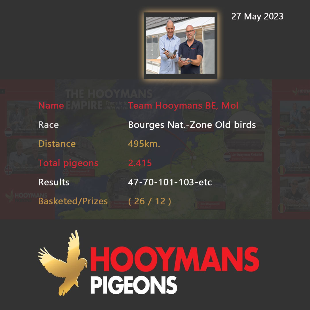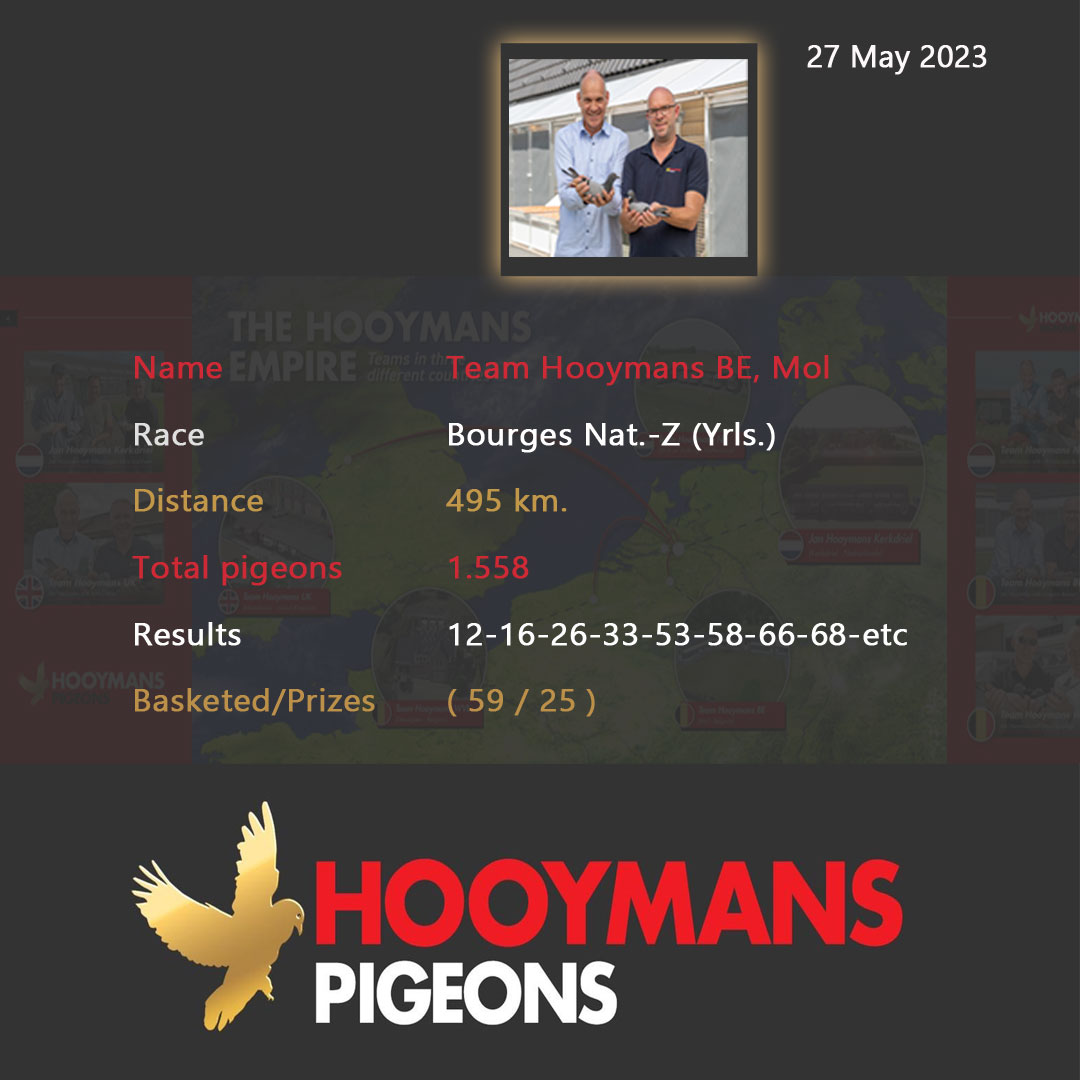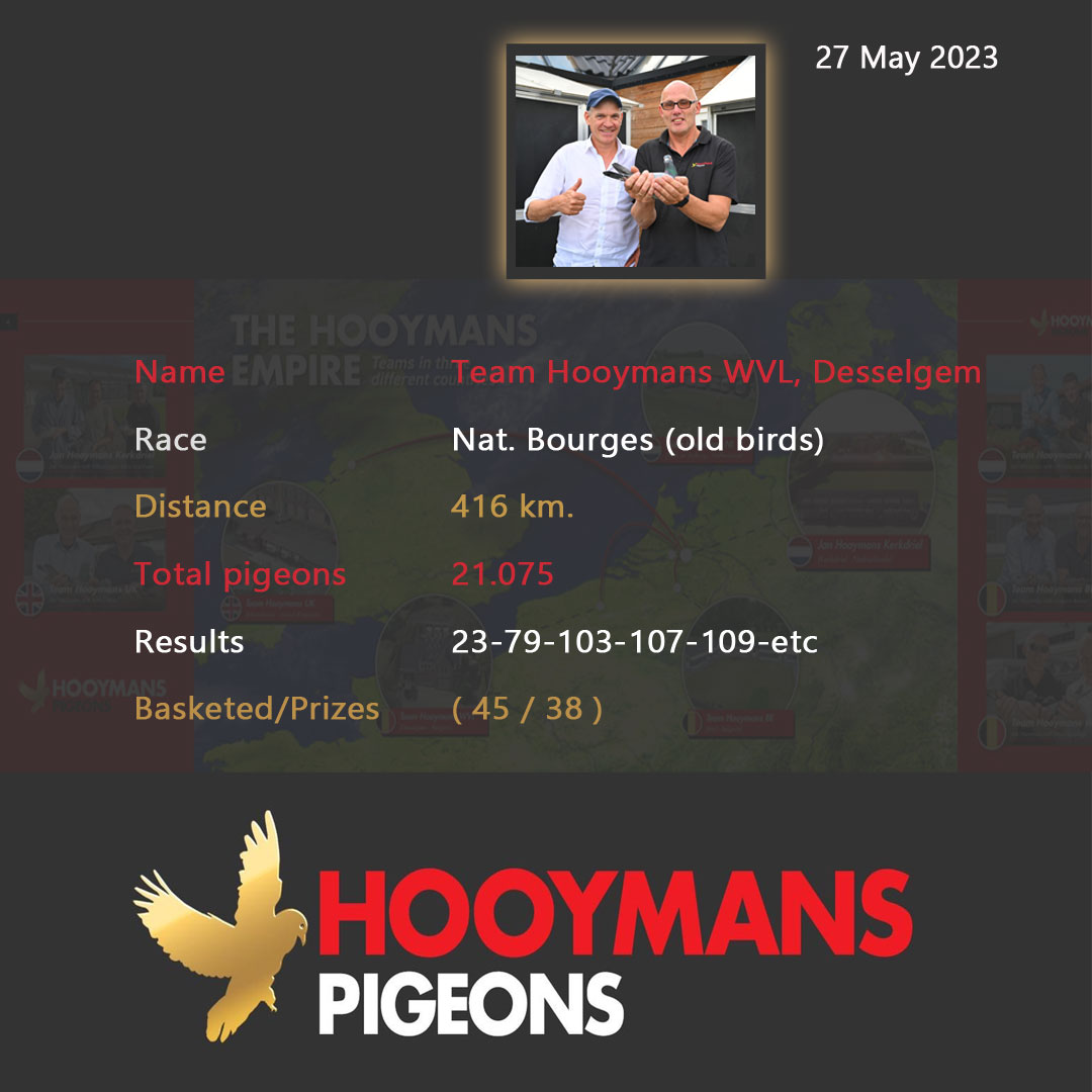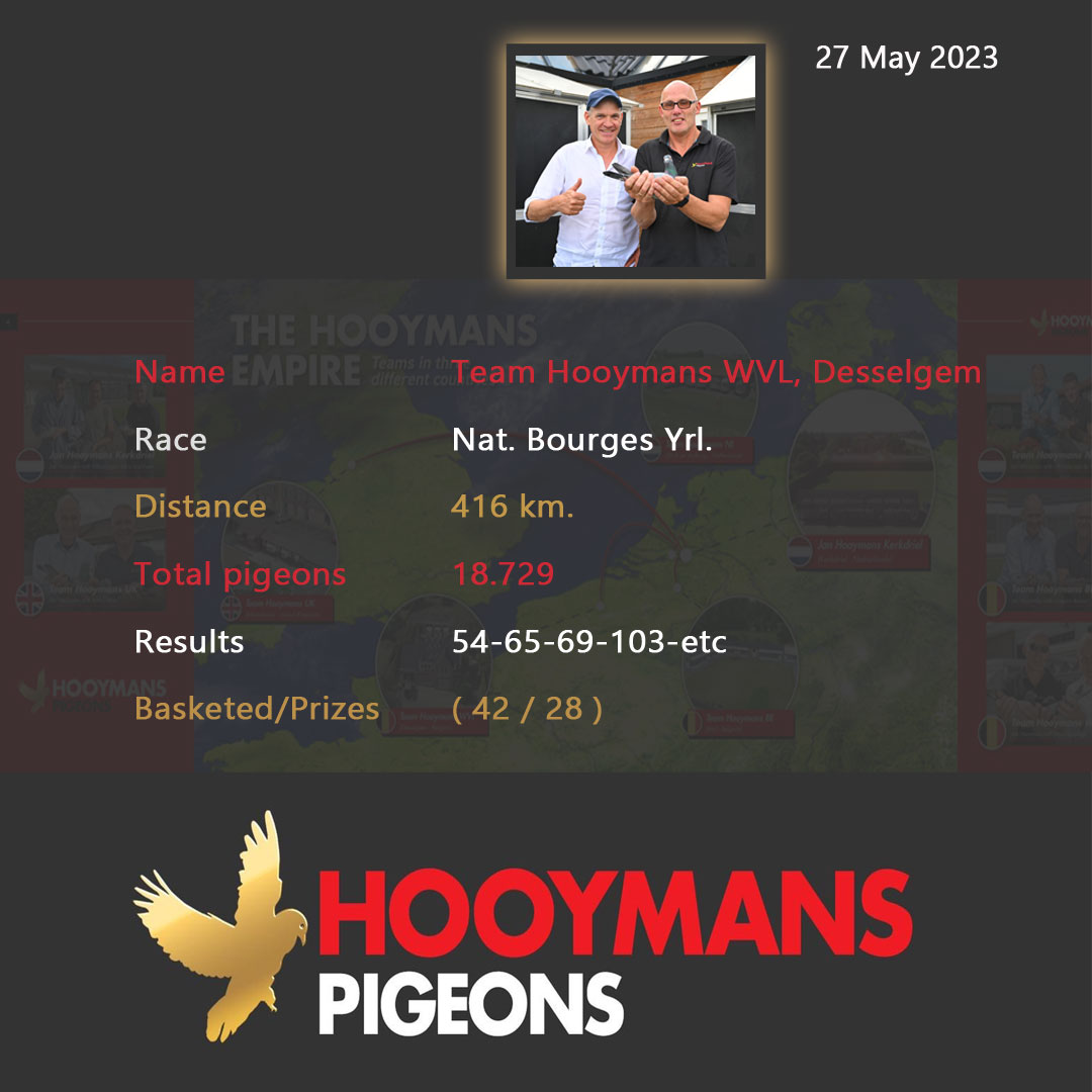 23-79-103-107-109e Nationaal bij de ouden en 54-65-69-103e Nationaal bij de jaarlingen. Team Hooymans BE maakte in de Nat-Zone een mooie uitslag en klokt 11 duiven in de top100 Nat-Zone.