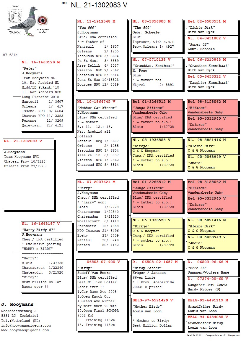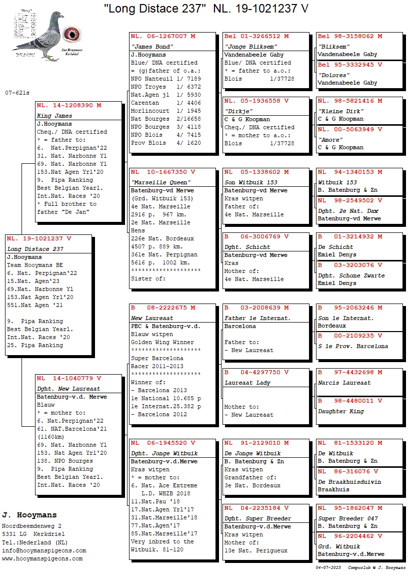 Team Hooymans BE won op National Agen KBDB de 15e en 151e Nationaal Ouden tegen 5.851 duiven en de 21e en 28e Nationaal Jaarlingen tegen 6.679 duiven. Hieronder de 4 pedigrees van de eerste duiven bij Gregory – Team Hooymans BE: