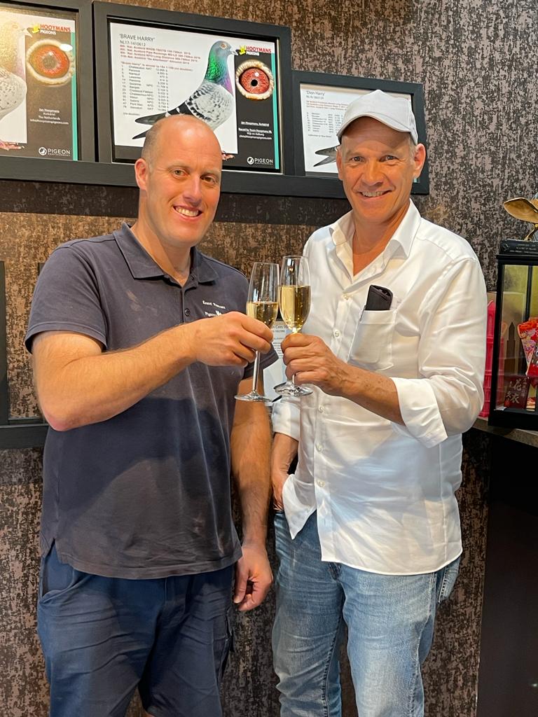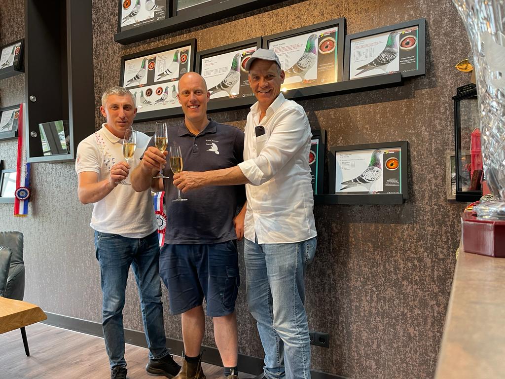 We korfden 61 ouden en jaarlingen in en winnen: 10-12-15-Provinciaal tegen 3.125 duiven (61/38). De 10e Provinciaal komt uit de “Peter” gekoppeld aan dochter van Harry x Birdy. De 12e Provinciaal is een jaarling duivin uit broer “New Harry” gekoppeld aan dochter van “Blue Baron” x “Supertje 102” (Docht. Bl.Brave). De 15e Provinciaal is een kleindochter van Harry Junior en Alexia. De marathon-duiven kregen een trainingsvlucht vanaf Nationaal Limoges om wat kilometers in de vleugels te krijgen voor een marathonvlucht waar ze naar toe gebracht gaan worden. Deze kwamen verder ook prima naar huis. De eerste duif wint de 48e Provinciaal bij de ouden maar voor de rest komen deze duiven wat snelheid tekort ten opzichte van de dagfond-duiven. Hieronder de stamkaart van de eerste duif, een foto van haar vader en een foto van nieuwe loftmanager Kristof die proost op veel overwinningen, samen met Jan.