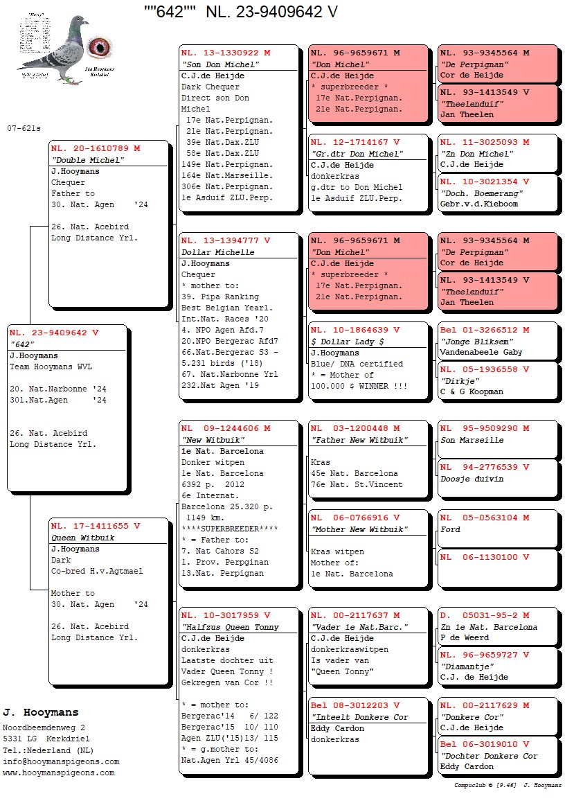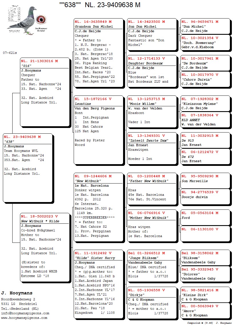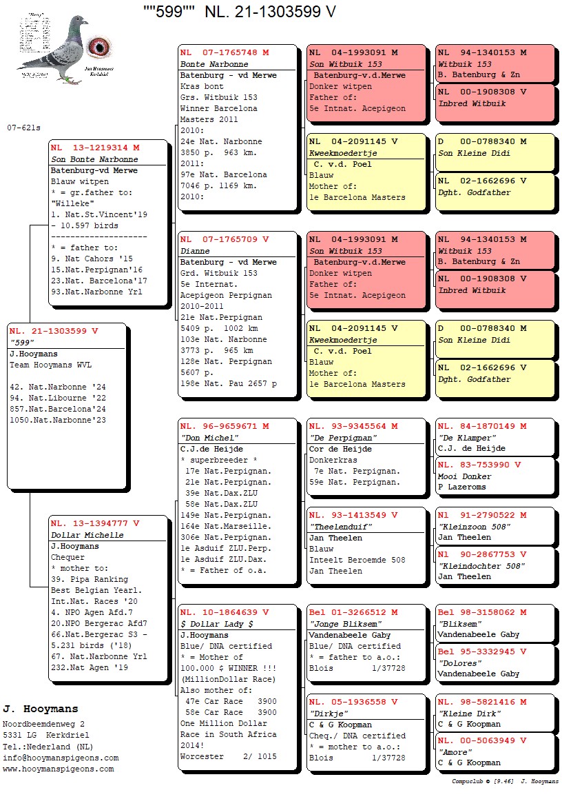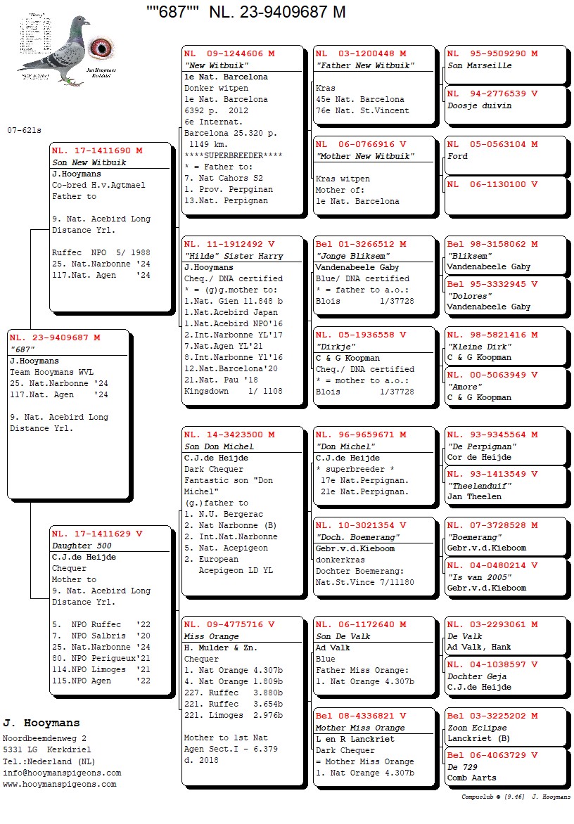 De derde jaarling, winnaar van 25e Nationaal Narbonne is de NL23-687. Deze duif wordt ook knap 9e Nationaal Asduif Grote Fond jaarlingen KBDB. Hieronder de stamkaarten van de kopduiven op Narbonne: