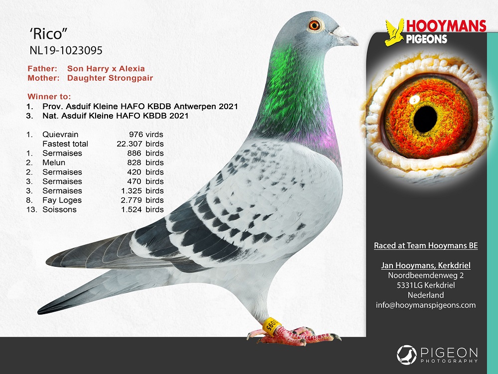 Team Hooymans NL korfde 28 jongen in voor Morlincourt en 20 duiven voor Niergnies (1 nacht mand). De uiteindelijke winnaar van Niergnies, NL23-9407927, was een doffer die eigenlijk bestemd was voor Morlincourt. Op de donderdagavond voor inkorving stond Christian in de deuropening de jonge duiven te observeren, toen deze rakker over zijn hoofd naar buiten schoot en fanatiek ging trainen. Omdat hij weigerde naar binnen te komen besloot een balende Christian hem de dag erna maar op Niergnies te spelen. En laat daarop juist deze doffer de Afdelingszege binnen te slepen, met 10 meter per minuut voorsprong op de concurrentie. De “927” is gekweekt uit “Solo”, een van de beste vliegers van Team Hooymans NL met onder meer 2 afdelingszege’s op zijn palmares, beide keren los vooruit. Dat zijn zoon dit ook doet lijkt dus geen toeval. Solo is overigens ook een broer van “Eva” en zij werd 1e Nationaal Asduif Midfond van Nederland en als jonge duif 5e Nationaal Asduif Jong van Nederland! Moeder van de winnaar is een volle zus van “Kleine Harry”, 1e Nationaal La Souterraine vorig jaar in België bij Team Hooymans BE. Ook een echte einzelganger, alle Nationale kopduiven vielen toen in het zuidwesten van België (Noord-oosten wind), maar “Kleine Harry” pakte in Mol op 1 van de verste afstanden toch de zege.