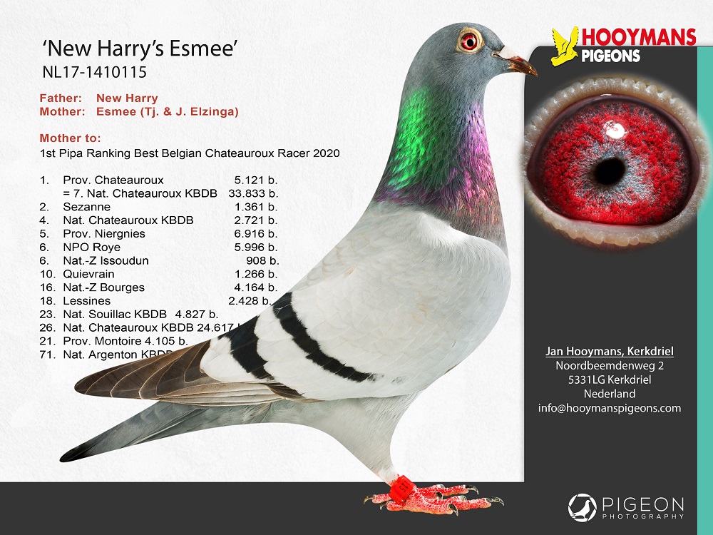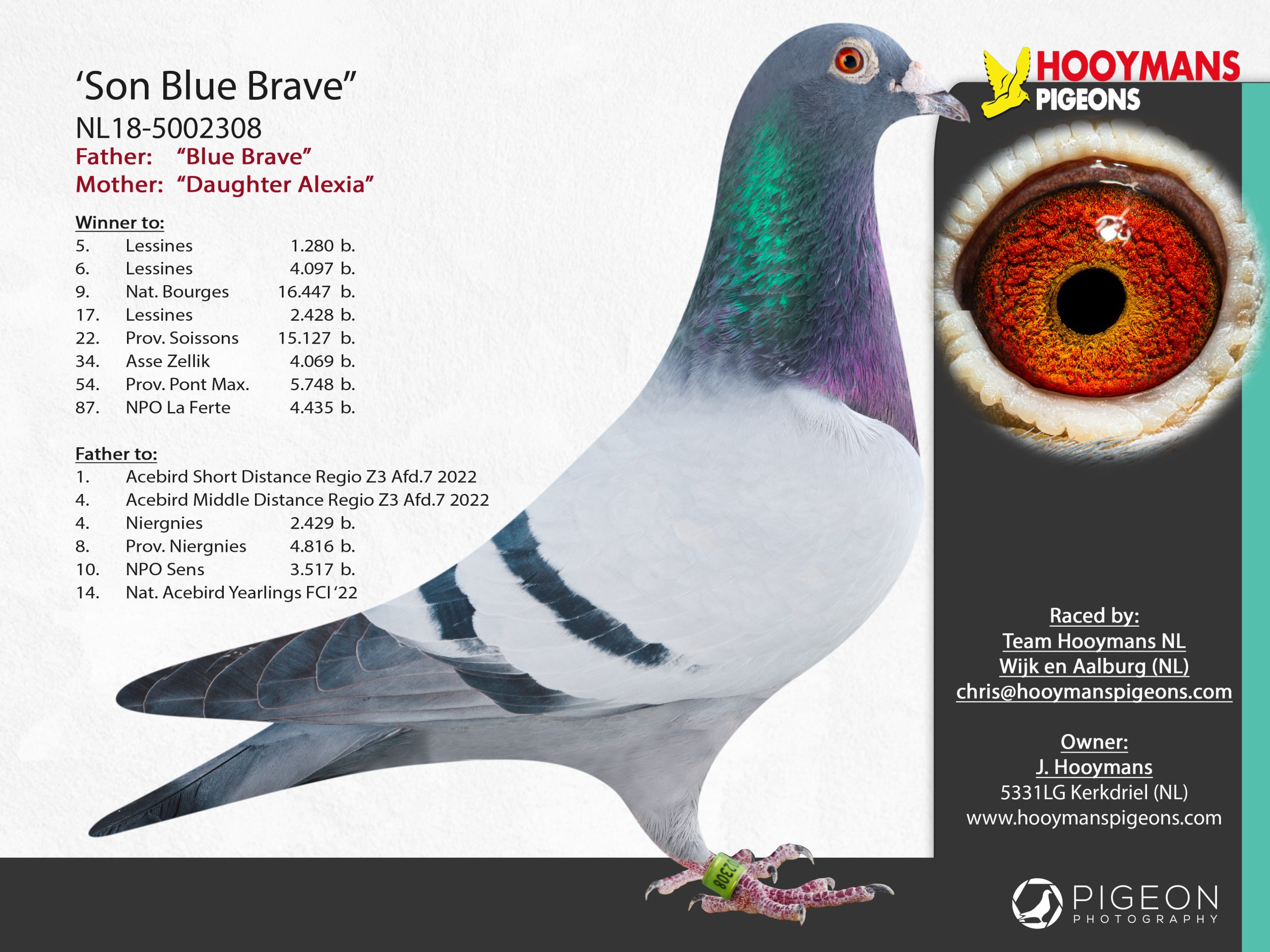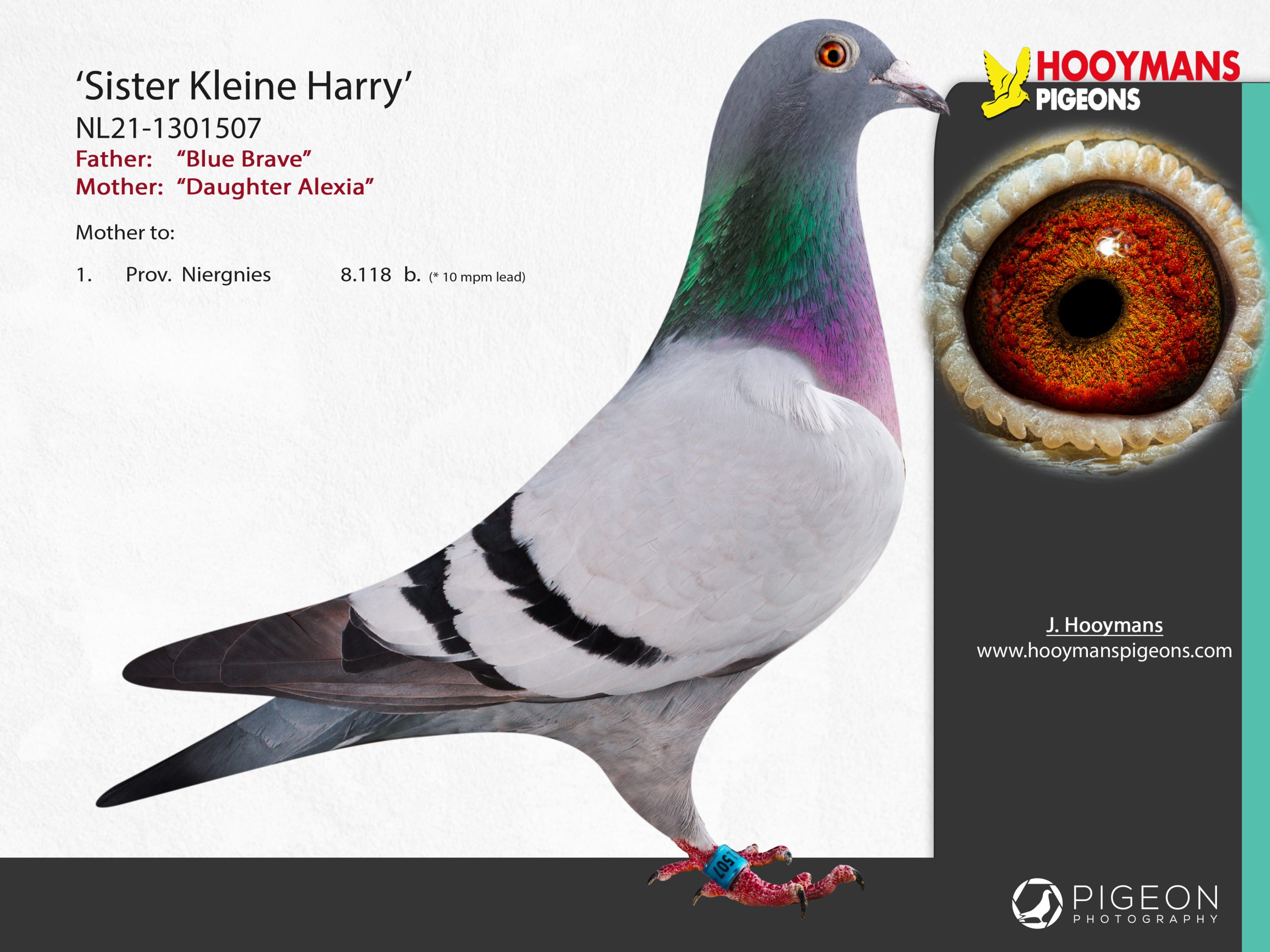 Haar vader is een zoon van “Blue Brave” en zelf een uitstekende vlieger bij Team Hooymans NL met o.a. 9e NPO Bourges tegen ruim 16.000 duiven. Hij is zwaar verwant aan de eerder genoemde crack “Kleine Harry”, want beiden hebben dezelfde vader (Blue Brave) en beiden hebben als moeder een dochter van “Alexia” (2 zusjes van elkaar). Moeder van de 1e Provinciaal is een inteelt dochter uit “New Harry” op 1 van zijn allerbeste dochters “Olympic Lieke”. Een broer van de winnares won eerder dit jaar top30 Nationaal van Bourges tegen ruim 20.000 duiven bij Team Hooymans BE.