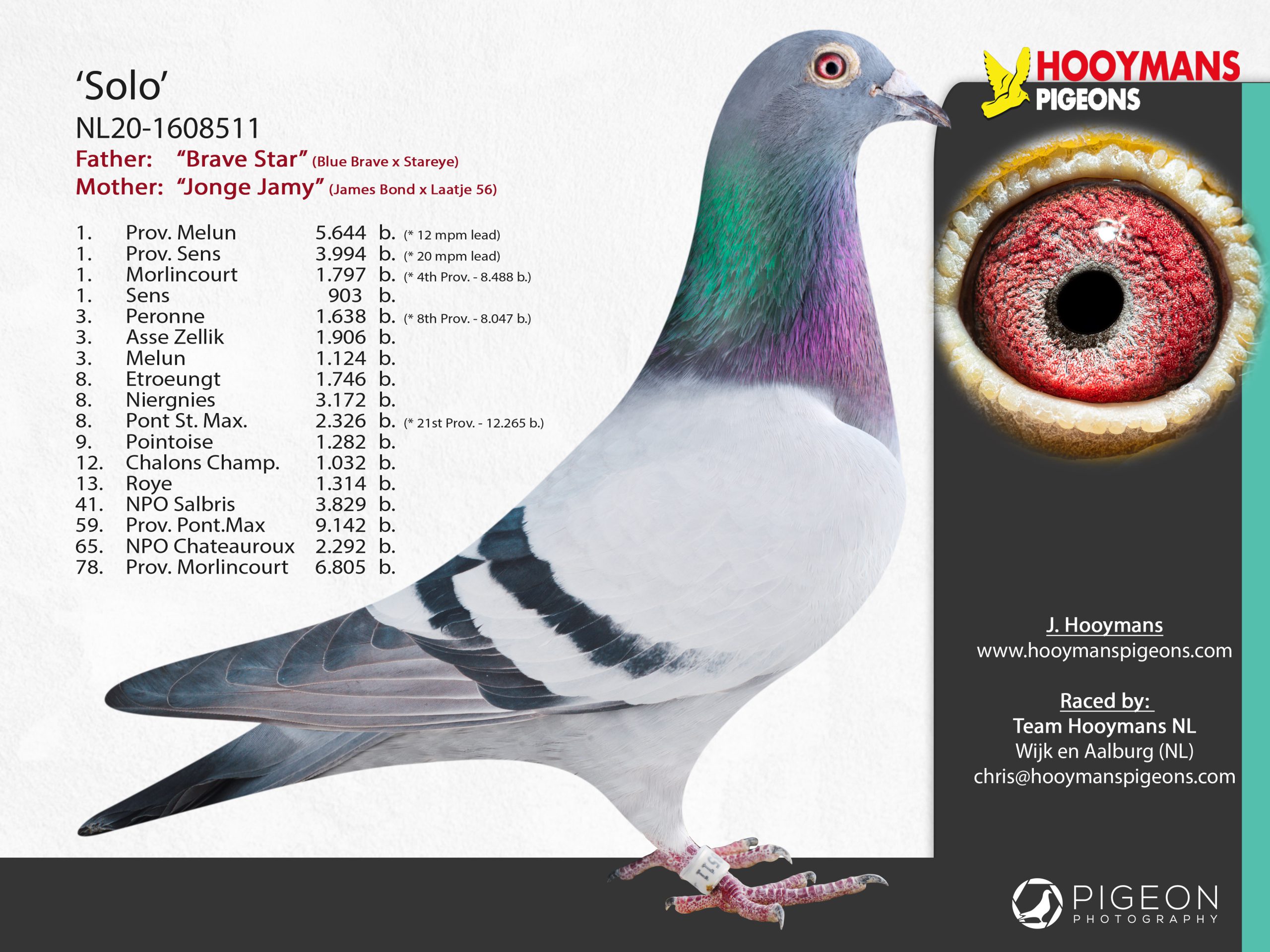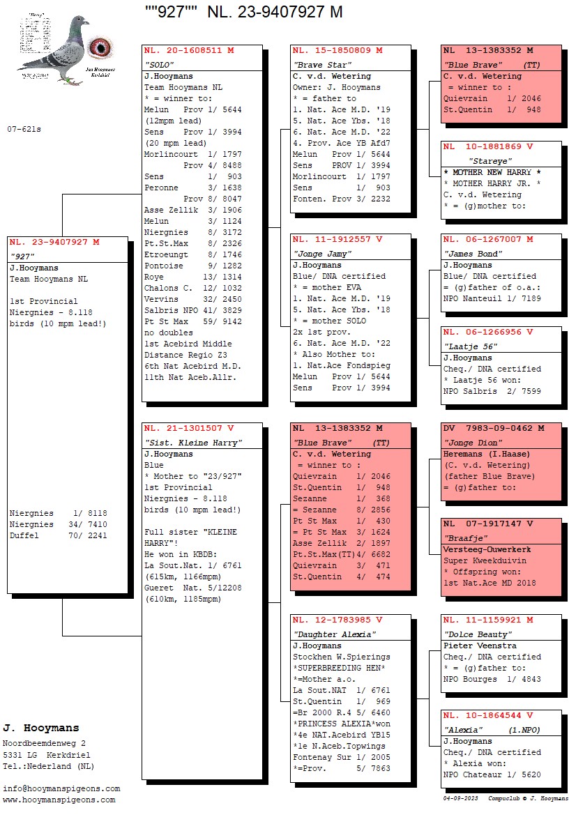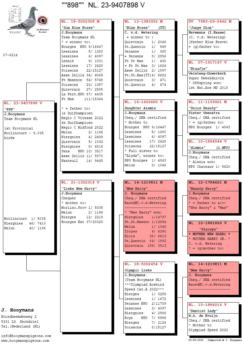 Haar vader is een zoon van “Blue Brave” en zelf een uitstekende vlieger bij Team Hooymans NL met o.a. 9e NPO Bourges tegen ruim 16.000 duiven. Hij is zwaar verwant aan de eerder genoemde crack “Kleine Harry”, want beiden hebben dezelfde vader (Blue Brave) en beiden hebben als moeder een dochter van “Alexia” (2 zusjes van elkaar). Moeder van de 1e Provinciaal is een inteelt dochter uit “New Harry” op 1 van zijn allerbeste dochters “Olympic Lieke”. Een broer van de winnares won eerder dit jaar top30 Nationaal van Bourges tegen ruim 20.000 duiven bij Team Hooymans BE.