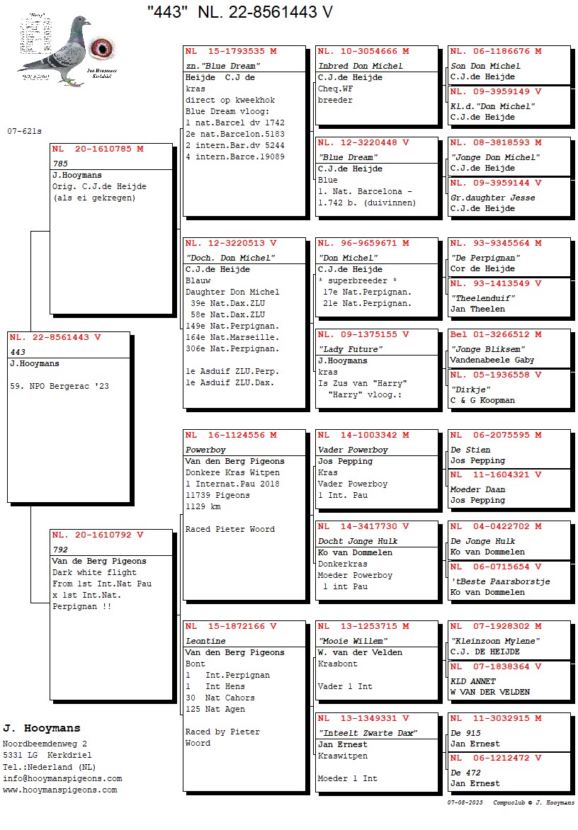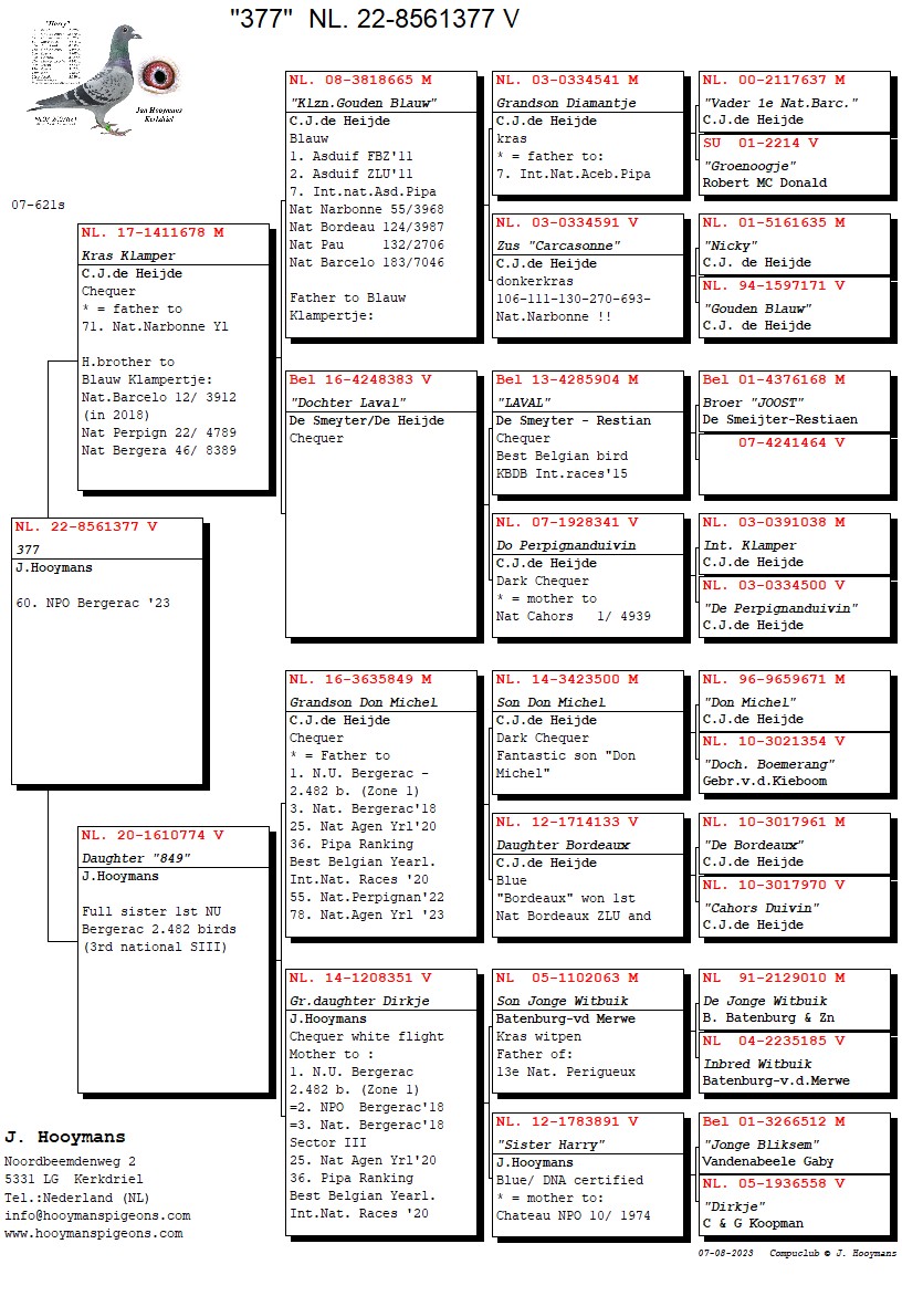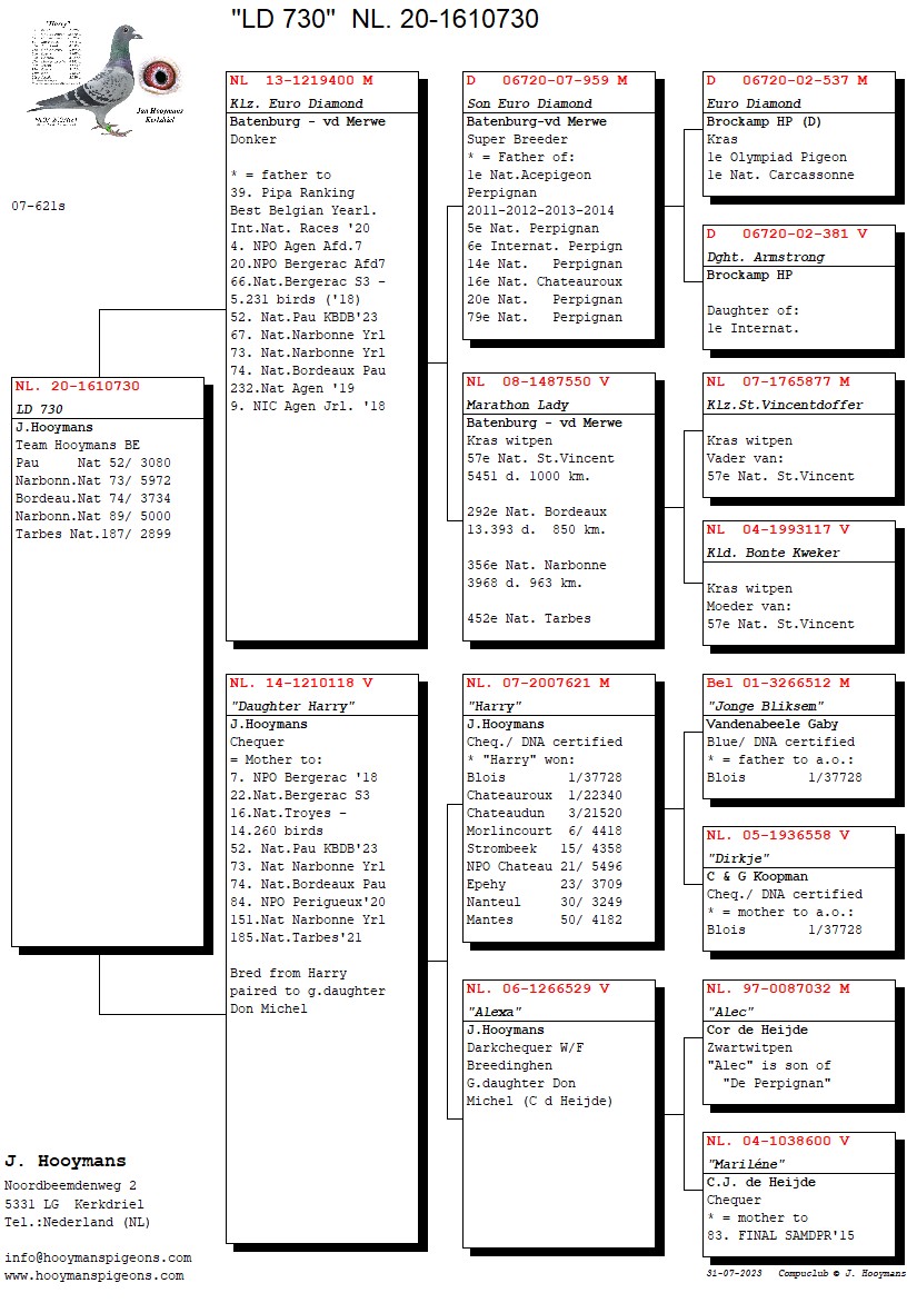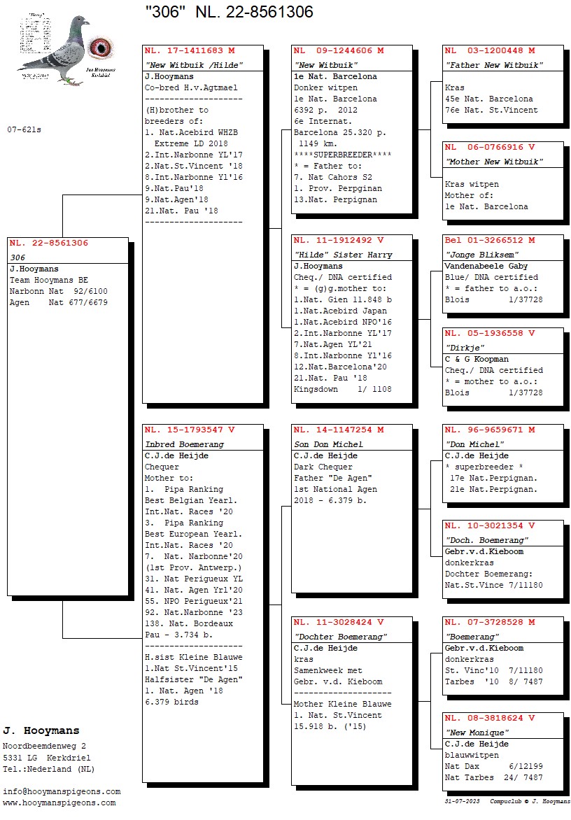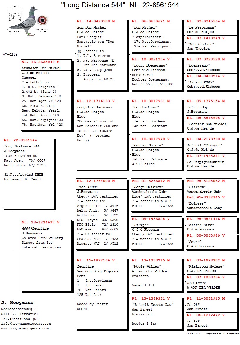Team Hooymans BE pakte een ramvroege: 9e Nationaal tegen 6.100 jaarlingen, maar ook de 92e Nationaal jaarlingen, en bij de ouden werd het de 89e Nationaal tegen 5.000 duiven met de 730 die eerder ook al vroeg zat op Pau en nu viermaal top100 Nationaal wint. De 9e Nationaal (607/22) werd tevens 23e nationaal asduif fond KBDB bij de jaarlingen en op plaats 31 staat de 544/22. Hieronder de stamkaarten van de kopduiven op Narbonne bij Team Hooymans BE