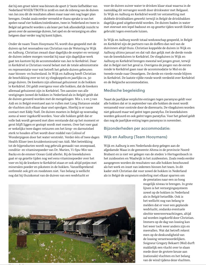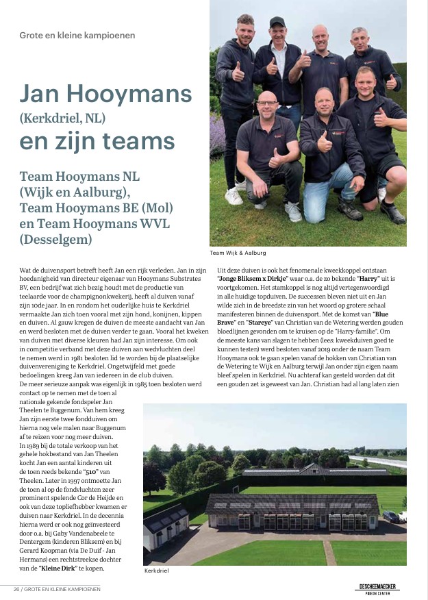 De eerste ronde is verdeeld tussen Team Hooymans BE (Mol) en J. Hooymans (Kerkdriel), evenals vorig jaar want een goed concept kun je beter niet wijzigen. In Mol is zeer sterk gevlogen met de ploeg jonge duiven, en in Kerkdriel werd het 1e duifkampioenschap Jonge Duiven van de regio binnen gesleept met die gedeelde 1e ronde. De tussenronde is ook verdeeld tussen beide hokken en de 2e volledige ronde is na het weekend speenklaar en verhuisd naar Desselgem, Team Hooymans WVL. Daar zijn per januari Gero & Evelien Dijk gestart met een nieuwe uitdaging als loftmanager, nadat Kristof in september aangaf te willen stoppen als teamlid. Hij heeft tot de januari nog zorg gedragen voor de kolonie. Gero en Evelien zijn uitstekende liefhebbers die ook al het nodige hebben gepresteerd. Hun “Theo” (1e Int. Agen) is inmiddels wereldberoemd en is op zijn oude dag verhuisd naar ons kweekhok. Momenteel is hij gepaard aan “Tonnie” (1e Nat. Barcelona) en ondanks zijn 12-jarige leeftijd is Theo nog goed vruchtbaar.