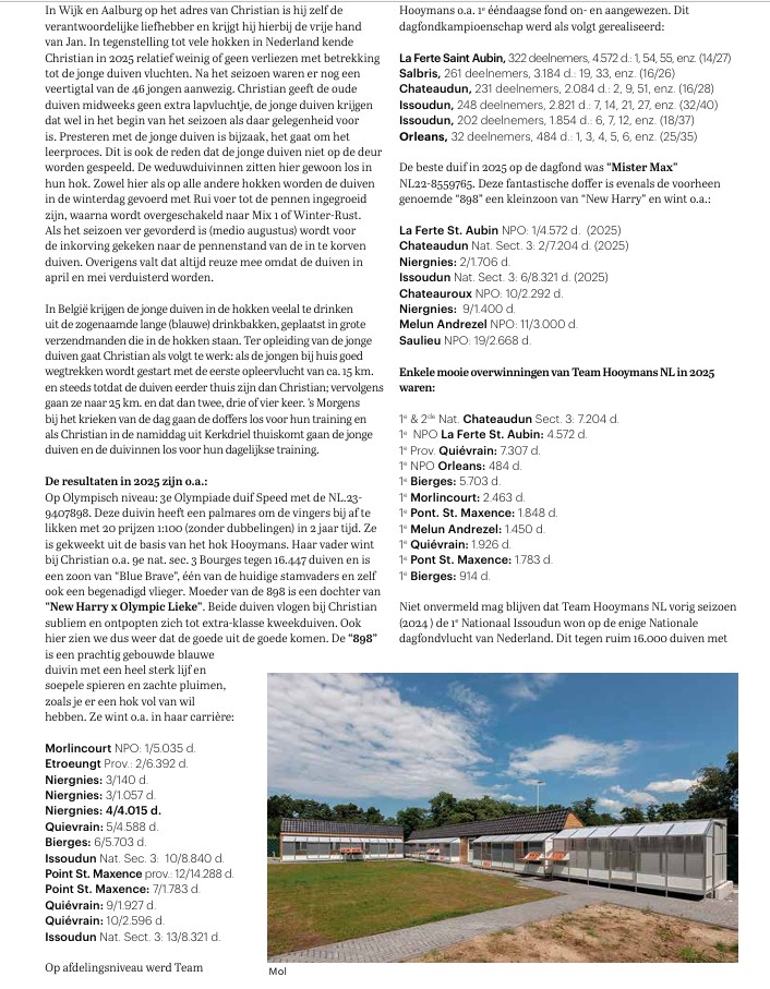 Onlangs verscheen in het Belgische duivenblad ” Duifke Lacht” een reportage over ons waarin teruggeblikt werd op seizoen 2025. Geschreven door Wout de Vries. Hieronder kunt u het nog eens rustig nalezen.