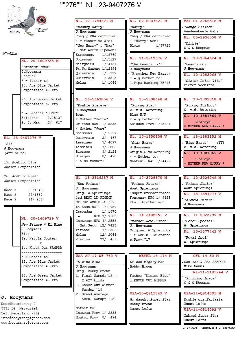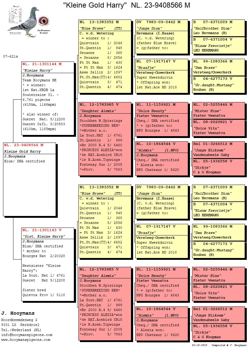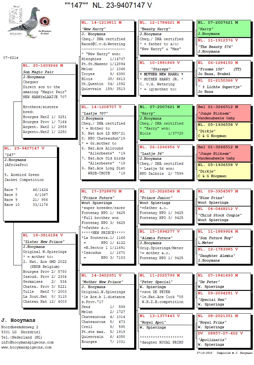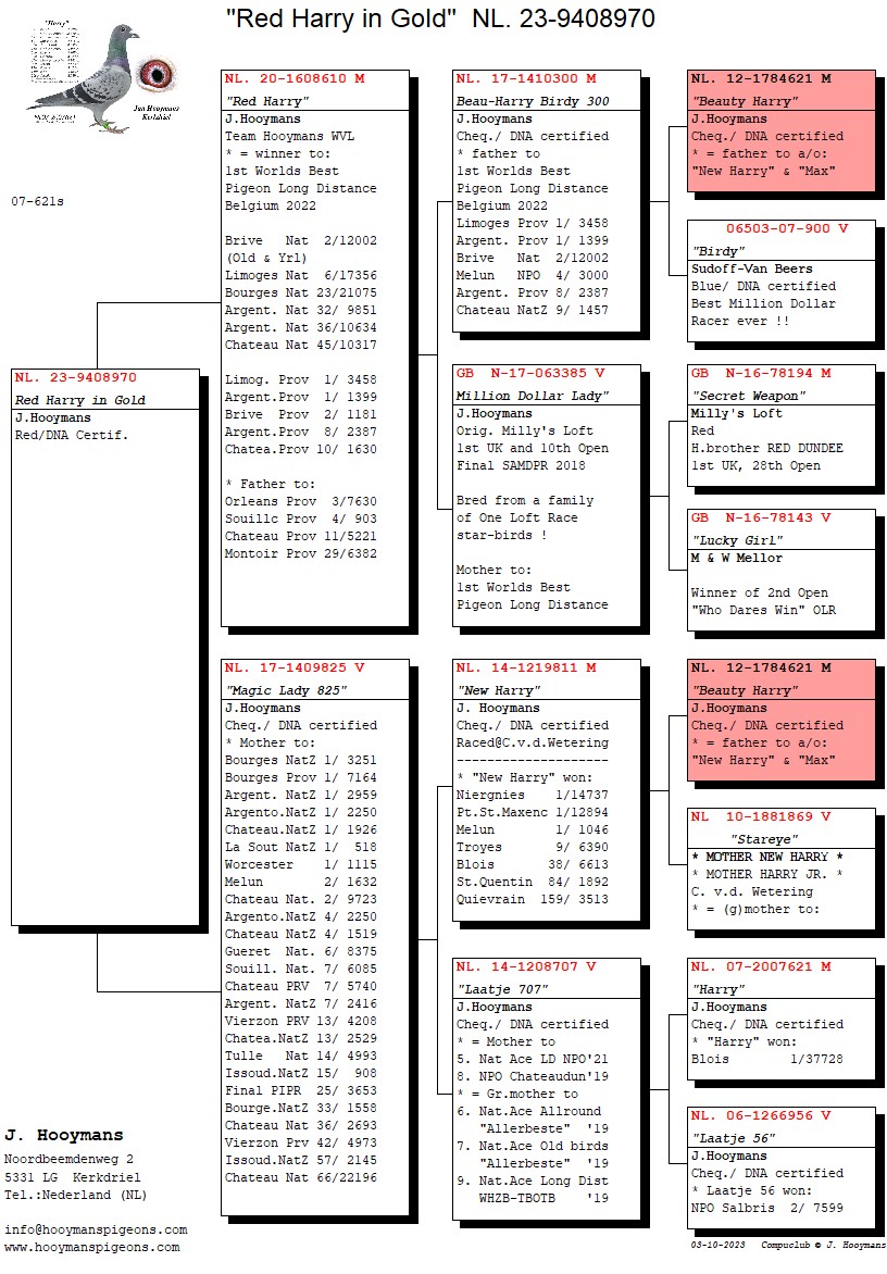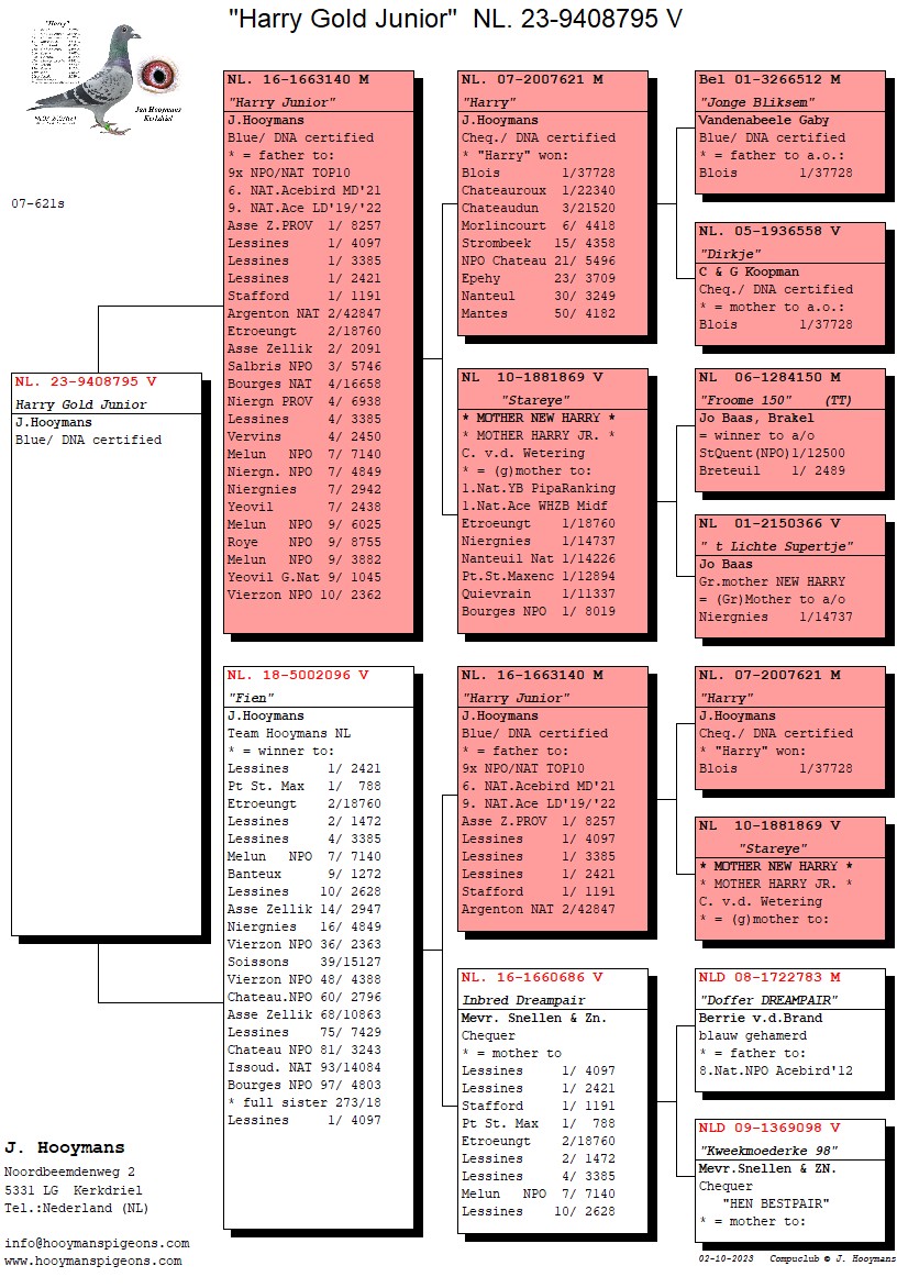– 1 duivin uit “Red Harry” (worlds Best Pigeon Long Distance, Belgie) x “Magic Lady 825” (moeder van o.a. 6 Nationaal-zone Winnaars)
