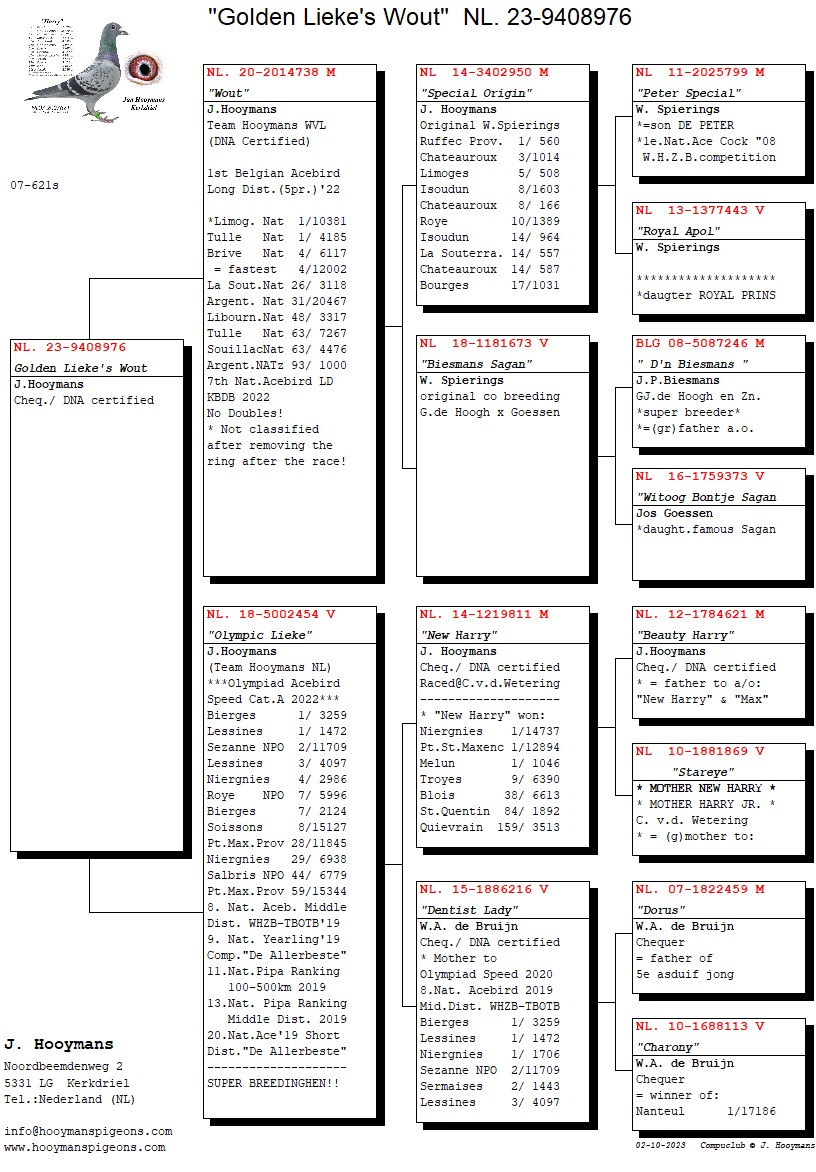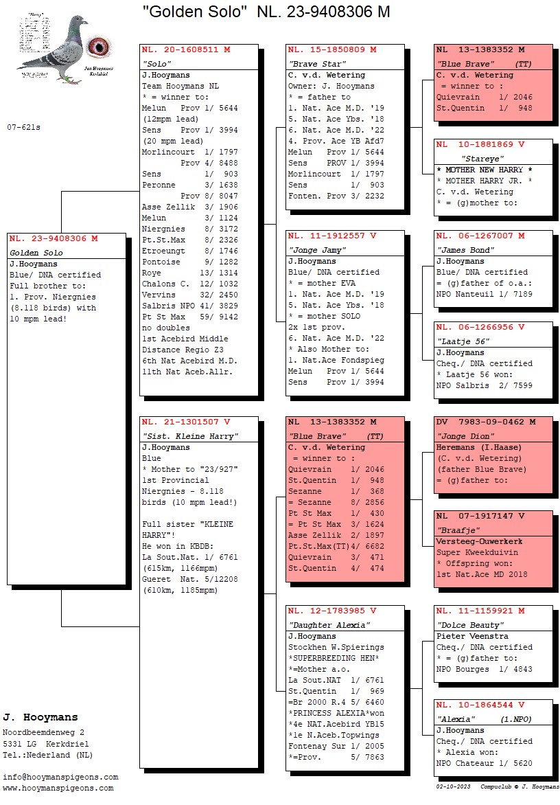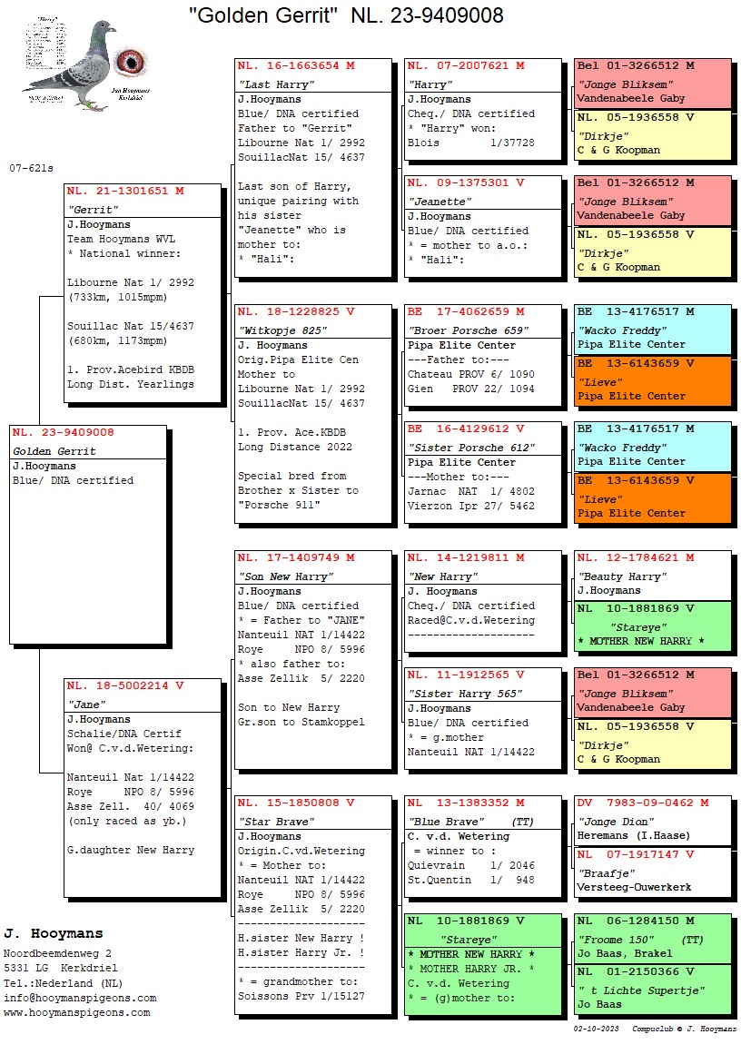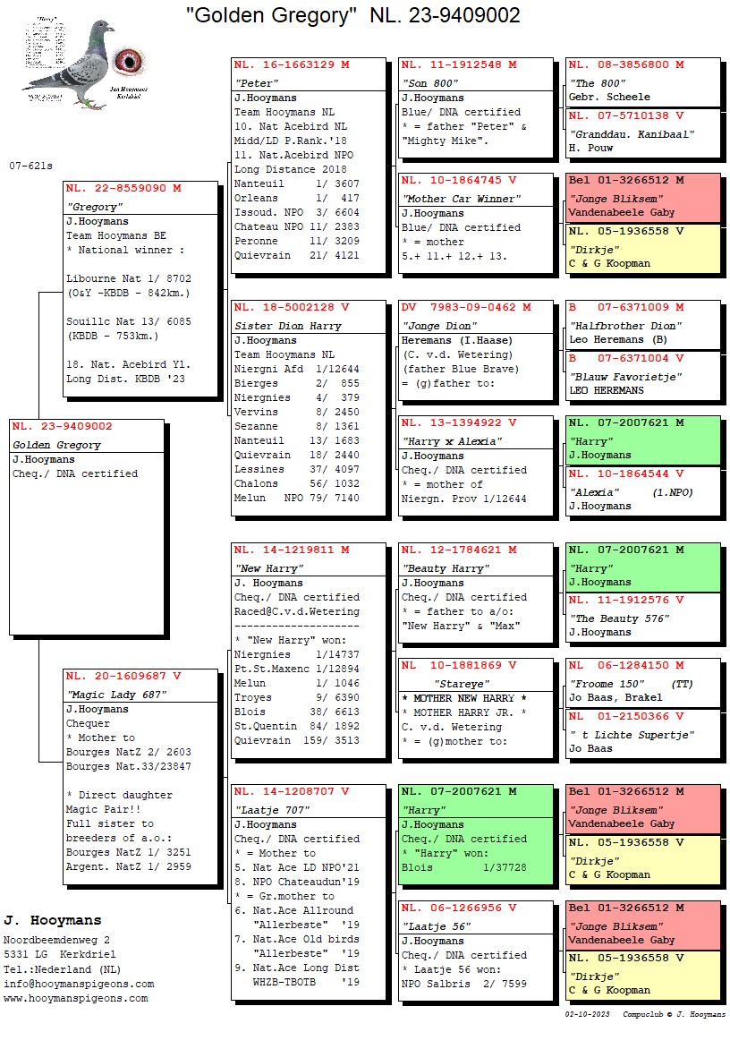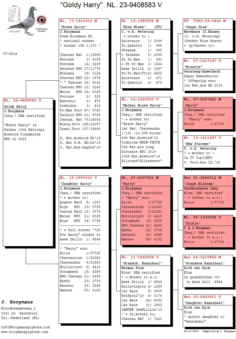 – 1 duivin uit “Red Harry” (worlds Best Pigeon Long Distance, Belgie) x “Magic Lady 825” (moeder van o.a. 6 Nationaal-zone Winnaars)