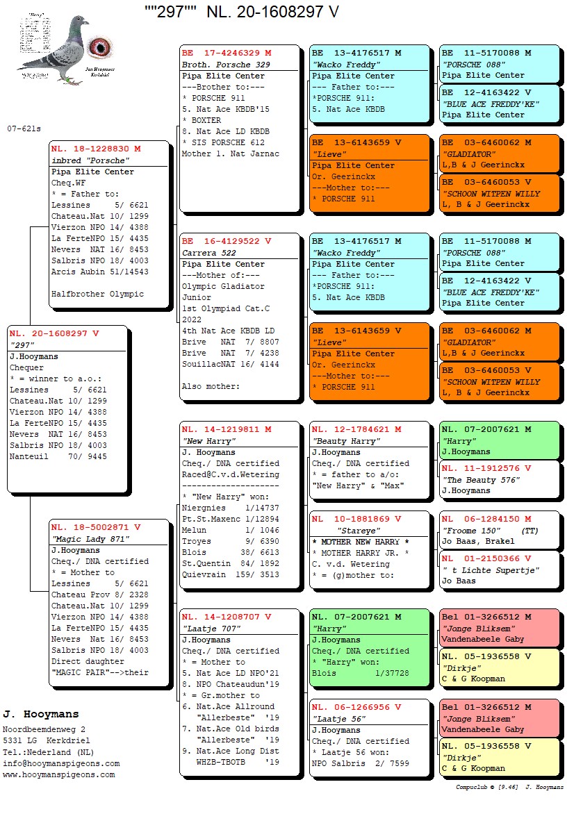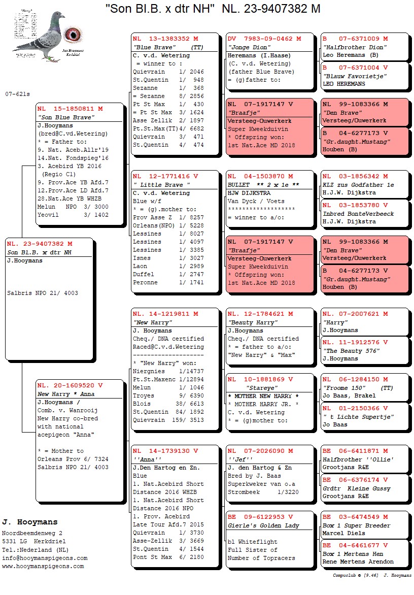 Dus twee mooie kopduiven gezien de nadelige wind. 66 duiven winnen prijs, dit zijn op 1 na allemaal dagfondduiven dus van de 125 stuks pakken er ongeveer 50% prijs. De eerste 2 duiven zijn beide kleinkinderen van New Harry. De eerste duif is gekruist met PEC-lijnen en een vaste waarde op het hok. De tweede duif is een jaarling doffertje en gekruist met Blue Brave-lijn.