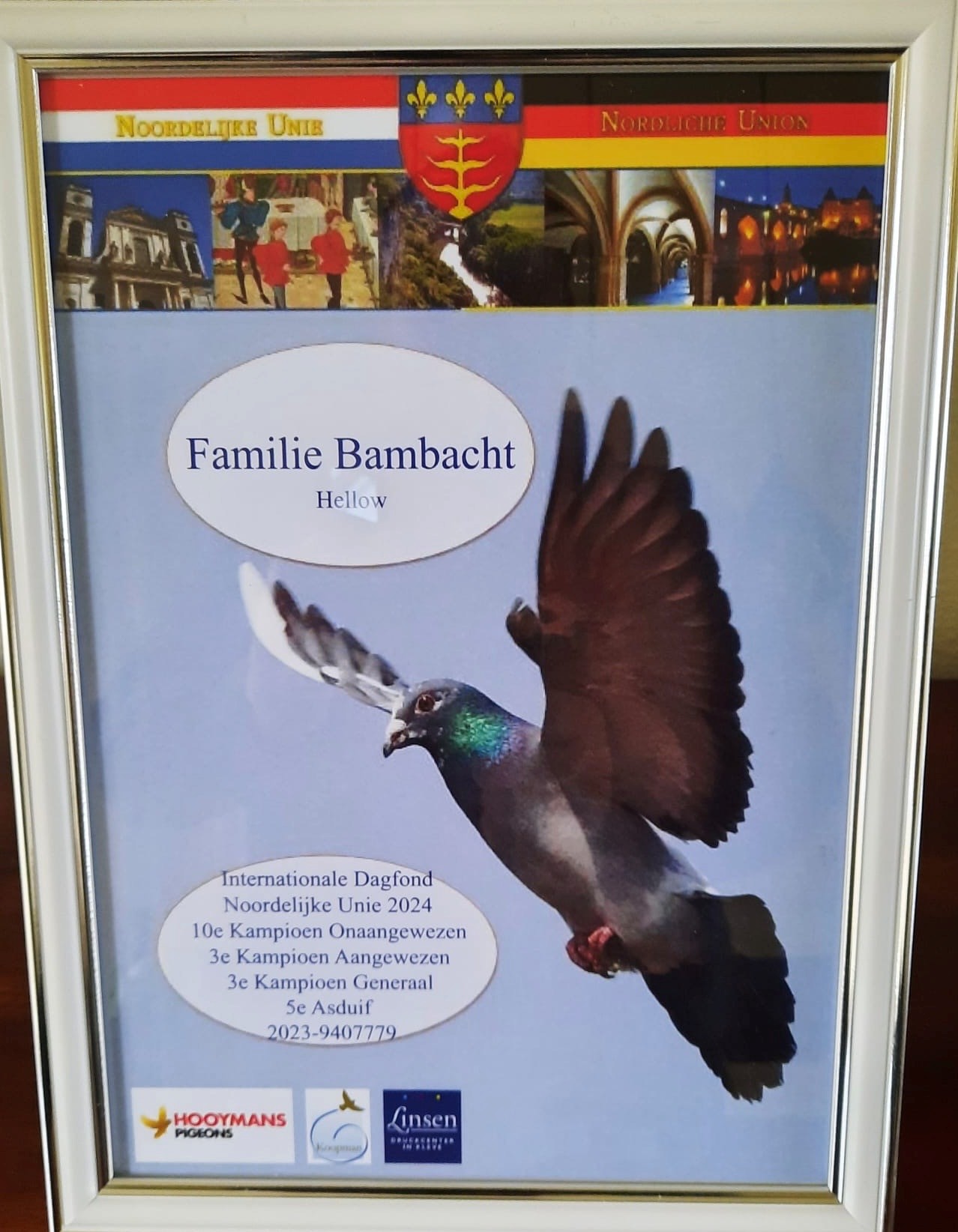 Daarbij had Familie Bambacht ook de 5e Asduif Dagfond Noordelijke Unie met de jaarling doffer NL23-9407779 die op de 3 Issoudun’s fantastisch presteerde met 3 kopprijzen. Hij is een kleinzoon van onze basisduiven New Harry en Alexia, gekruist op superbloed van “Carnival Wonder” (A. Möller) en “Yolanthe” (H. Hak). Hieronder de afstamming van de “779”