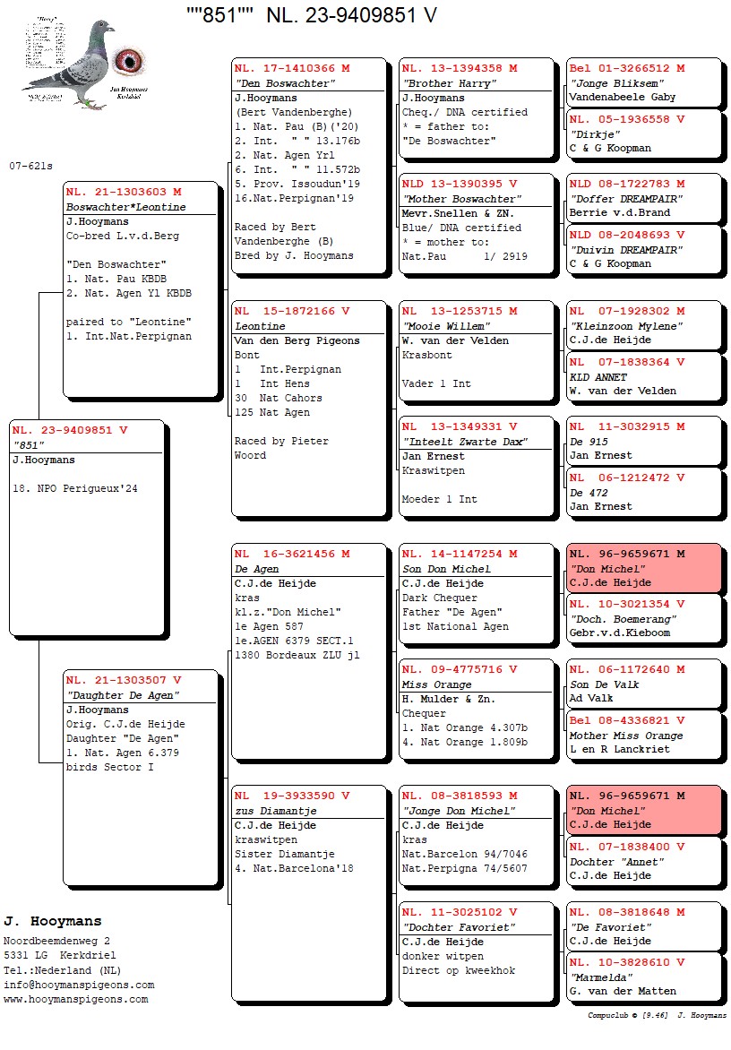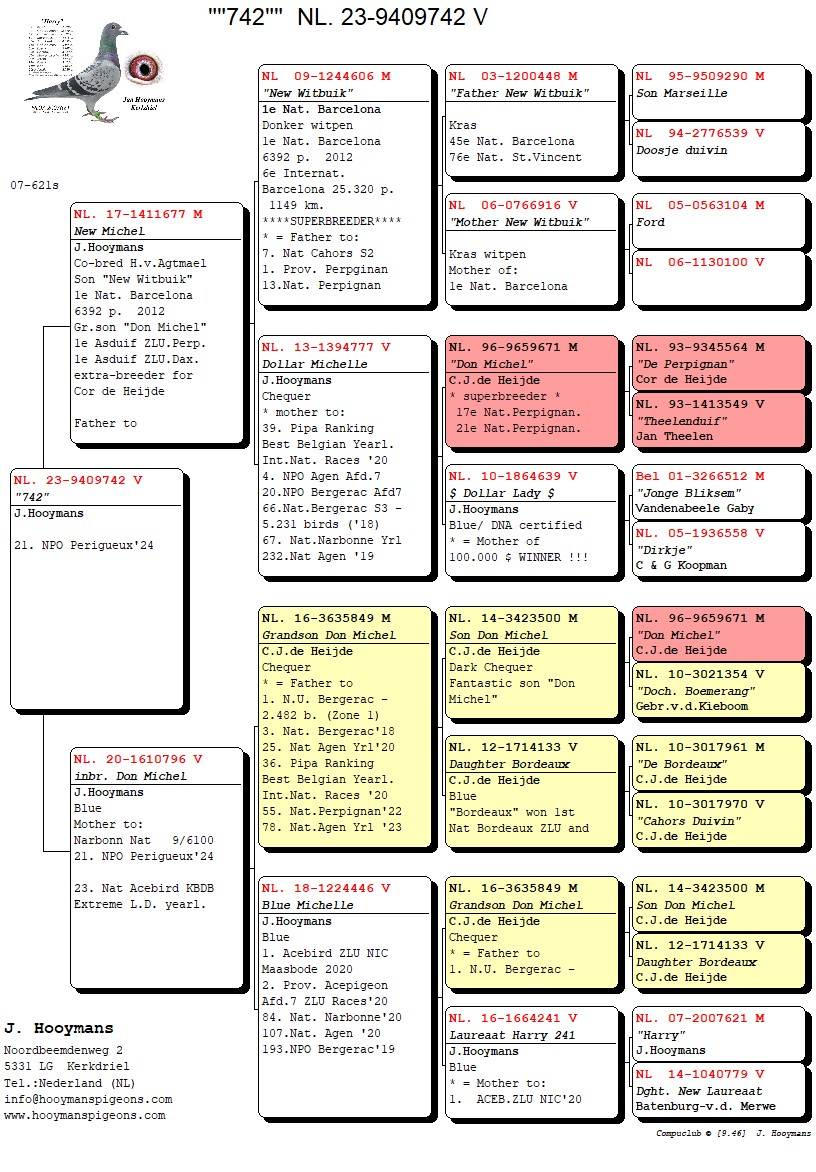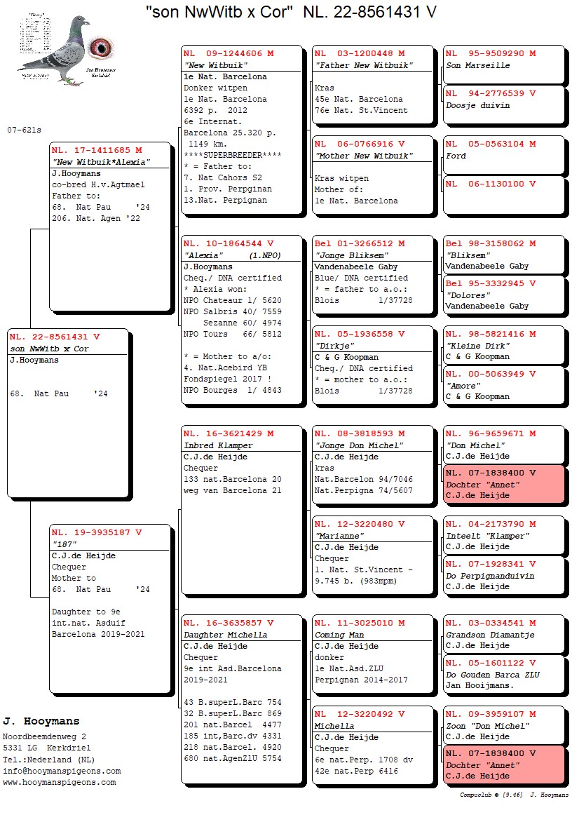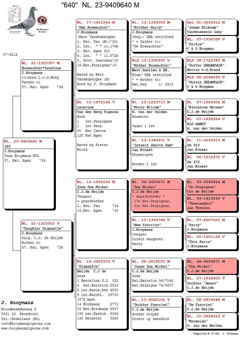 Team Hooymans WVL pakt de 57e Nationaal en deze doffer is een kleinzoon van de hierboven al aangehaalde topkoppeling “Boswachter x Leontine”. Aan moederskant zien we een duivin uit “Zoon Don Michel” met het “Diamantje”, twee wereldduiven van Cor de Heijde. Deze zoon “Don Michel” is overigens ook grootvader van de 1e Internationaal Pau 2024!