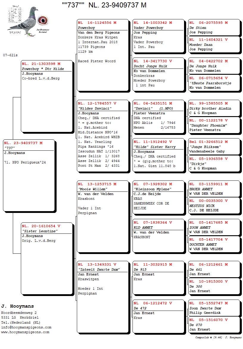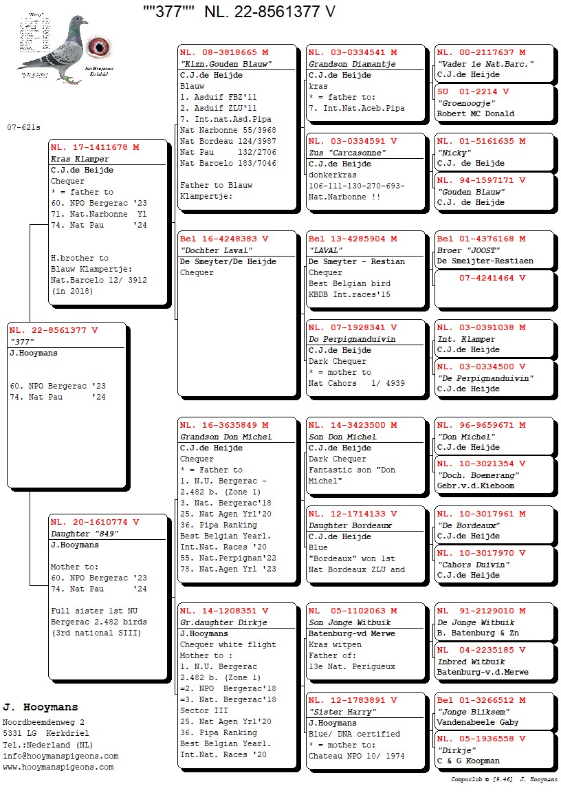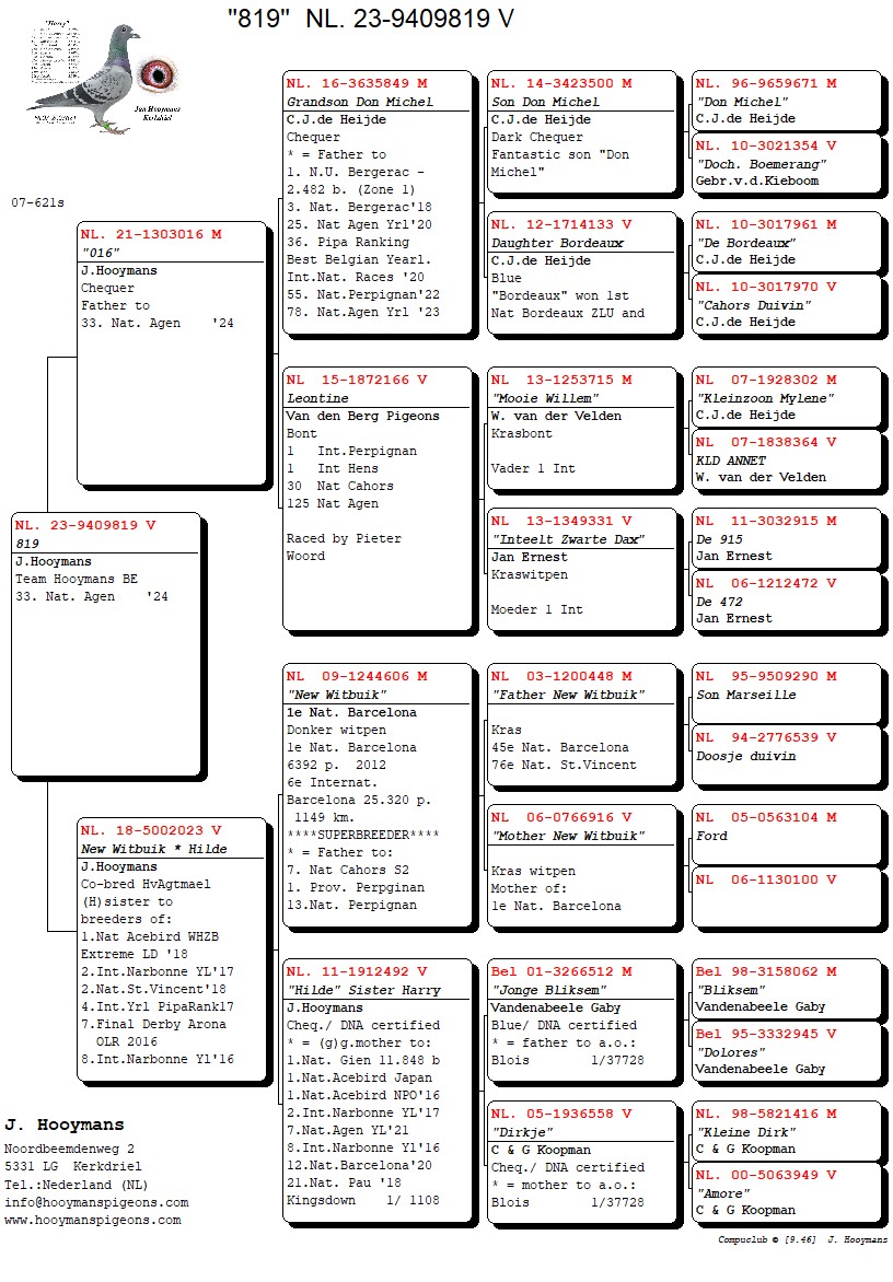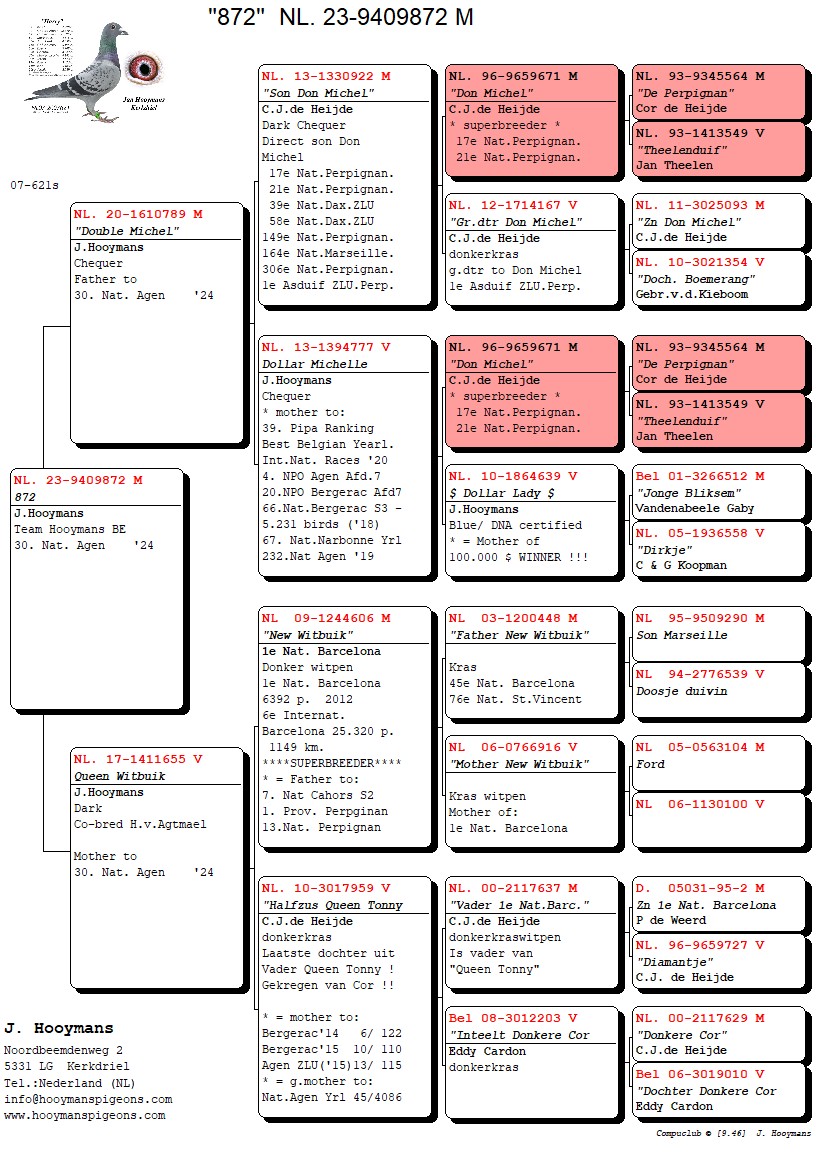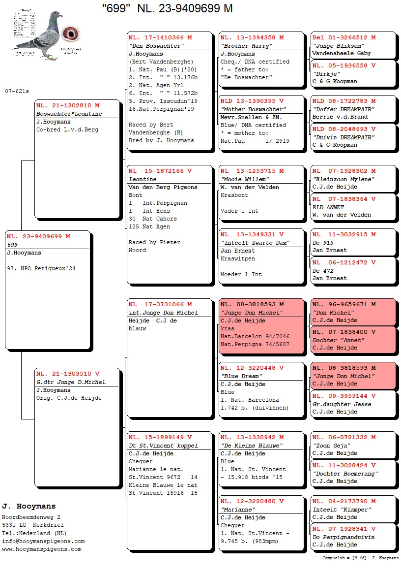 Team Hooymans WVL pakt de 57e Nationaal en deze doffer is een kleinzoon van de hierboven al aangehaalde topkoppeling “Boswachter x Leontine”. Aan moederskant zien we een duivin uit “Zoon Don Michel” met het “Diamantje”, twee wereldduiven van Cor de Heijde. Deze zoon “Don Michel” is overigens ook grootvader van de 1e Internationaal Pau 2024!