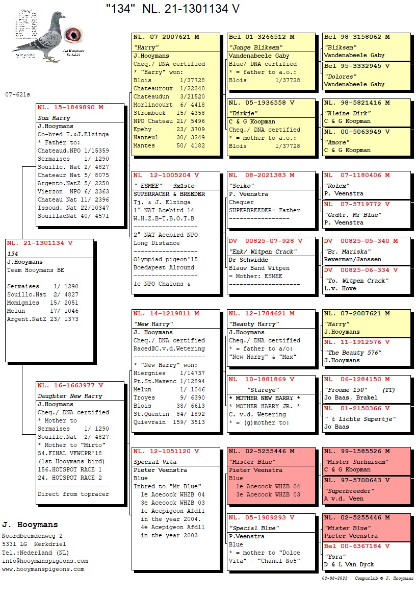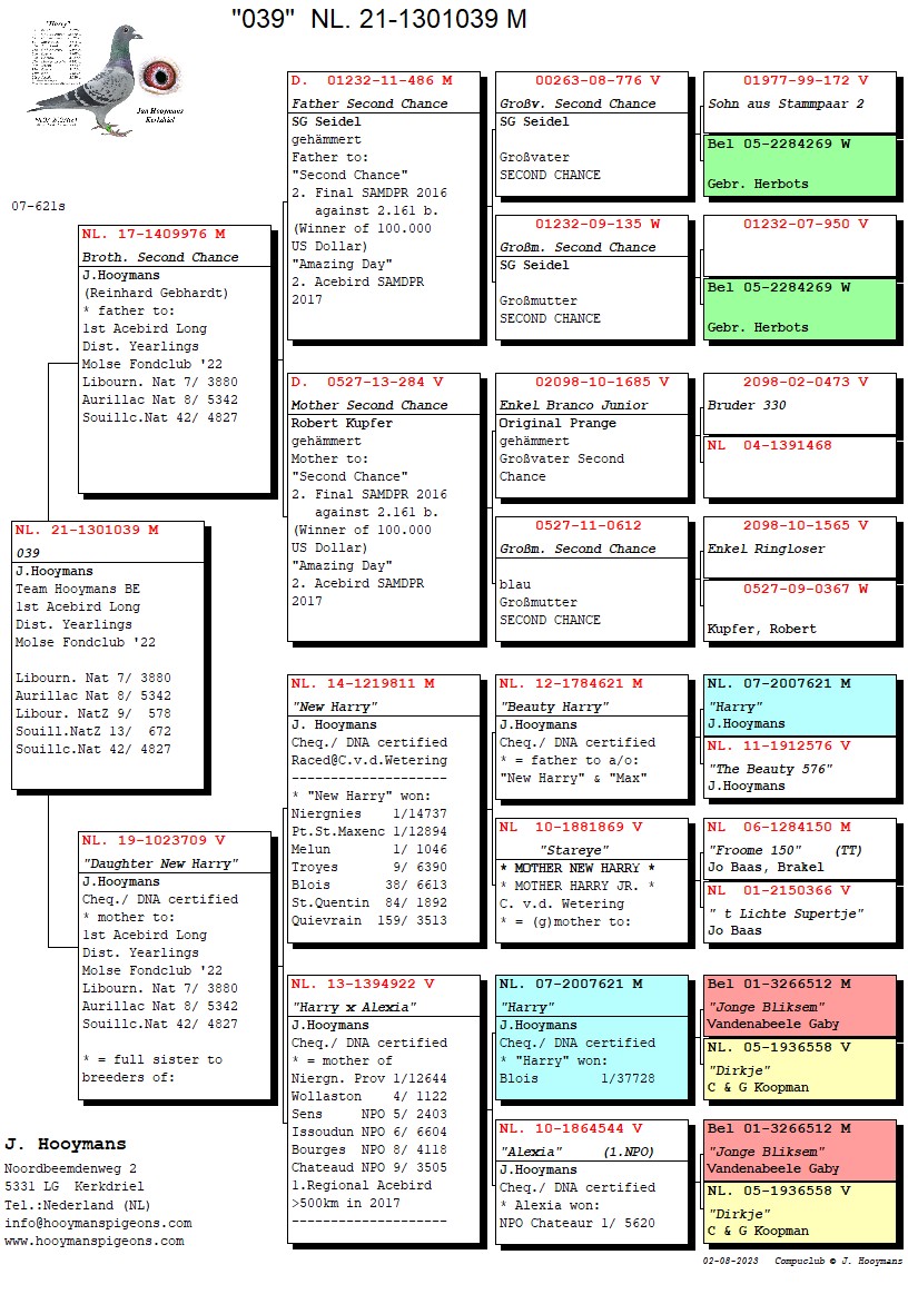 2e duif 21/094 uit zoon Magic Pair (New Harry x Laatje 707) met ingeteelde dochter Blue Brave en dus halfzuster van “Kleine Harry”