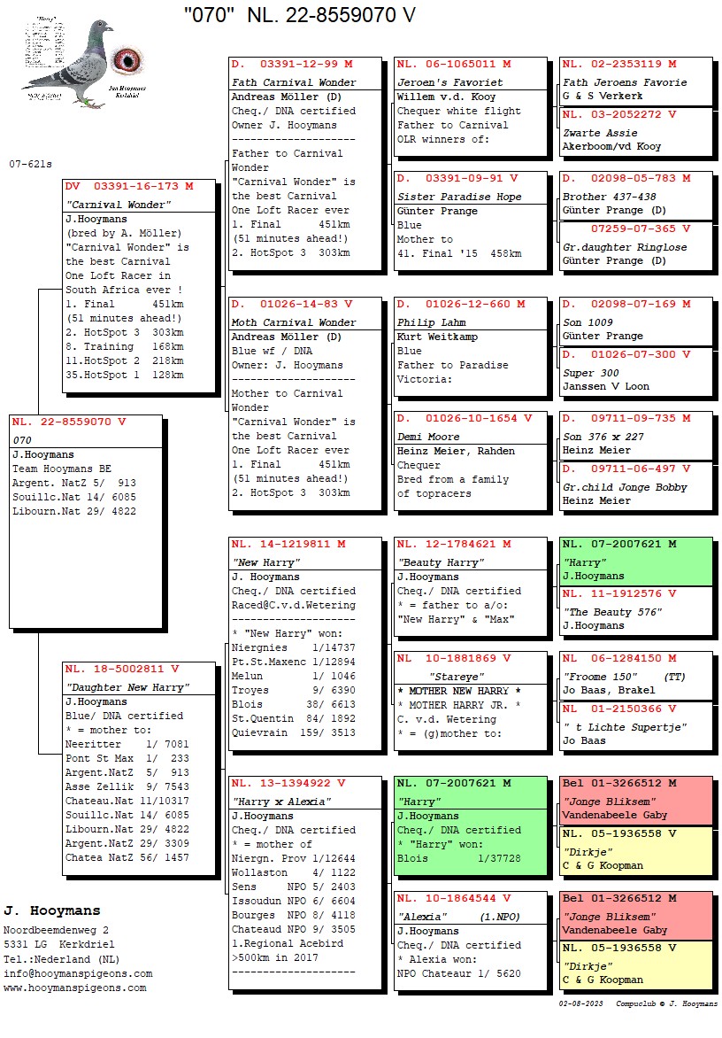 3e duif is 070/22 een directe zoon van Carnival Wonder gekoppeld aan dochter New Harry