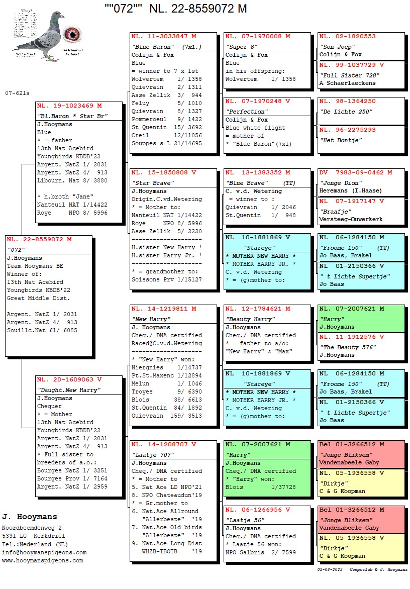 7e duif is de 072/22, vorig jaar als jong de 13e nationaal asduif en dit jaar winnaar 1e Nationaal Zone Argenton en nu opnieuw top met 61e Nationaal Souillac. Zijn vader komt uit de Baron met dochter Blue Brave en zijn moeder is een dochter van het Magic Pair “New Harry x Laatje 707”
