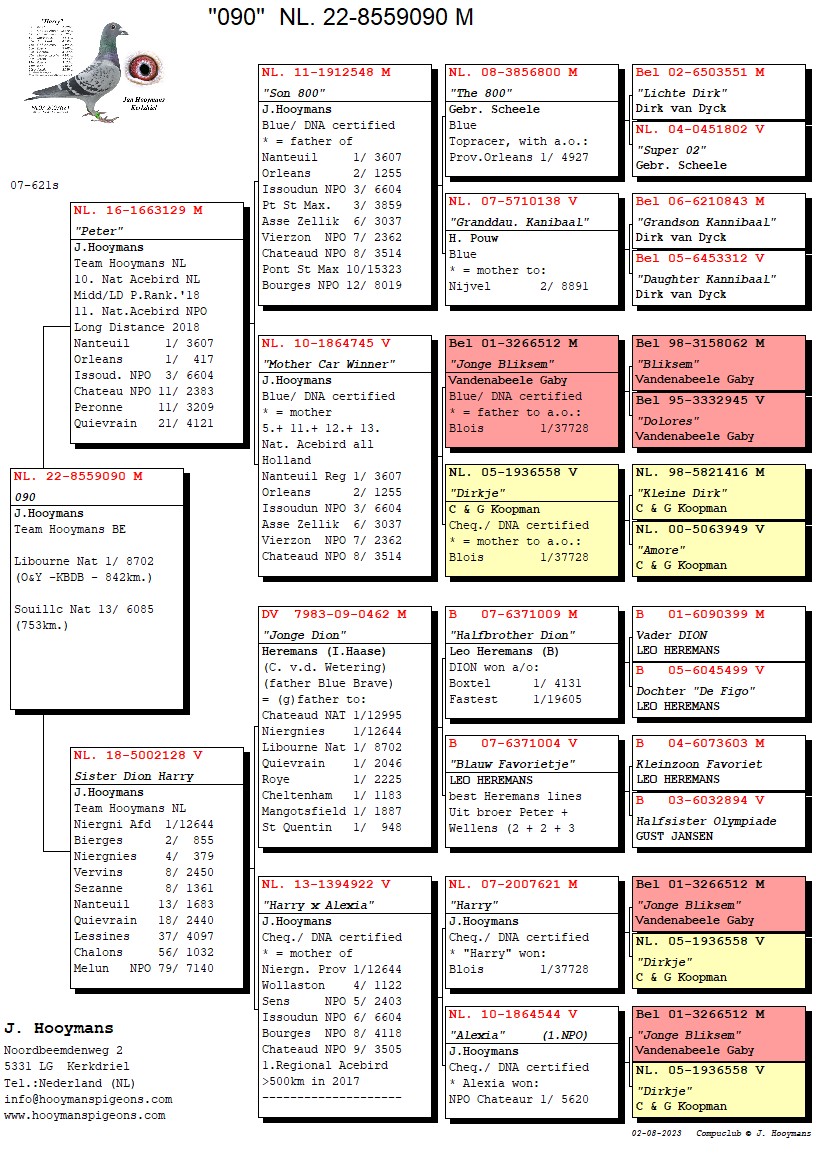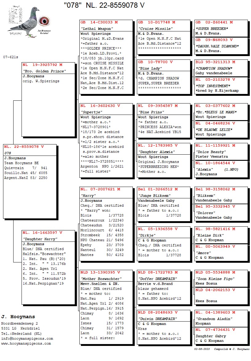 5e duif is de 120/22 die nu de 20e, 28e en 40e Nationaal wint 3 weken op rij (ruim) boven de 700 kilometer. Een knappe jaarling! Vader is zoon van New Harry met Alexia en moeder is via Spierings en halfzus van de “Wout”, de voor ons legendarische en morele winnaar van 2x 1e Nationaal KBDB.