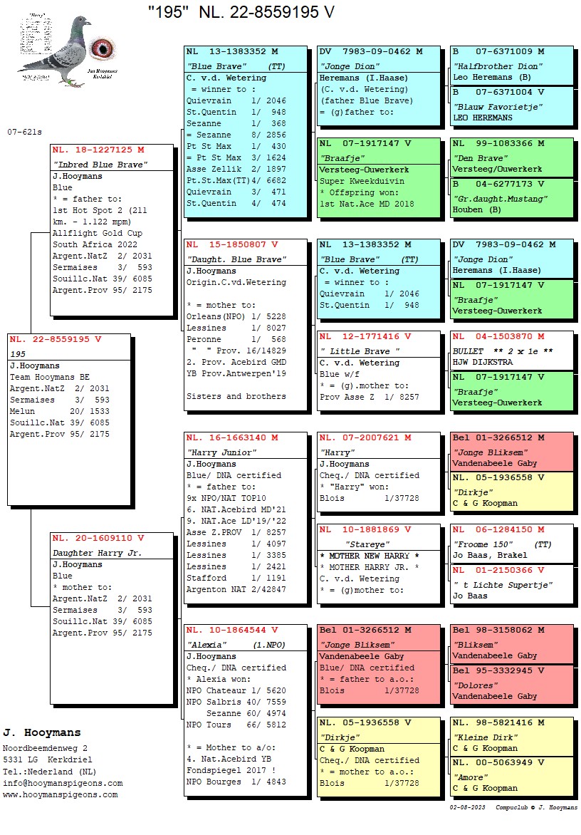 4e duif is 195/22 een puik duivinnetje dat eerder de 2e Nationaal-Zone Argenton wist te winnen en nu zicht met een 39e Nationaal opnieuw goed laat zien. Haar vader is een halfbroer van “Kleine Harry” (Uit Blue Brave x dochter Blue Brave) en haar moeder is uit Harry Junior x Alexia