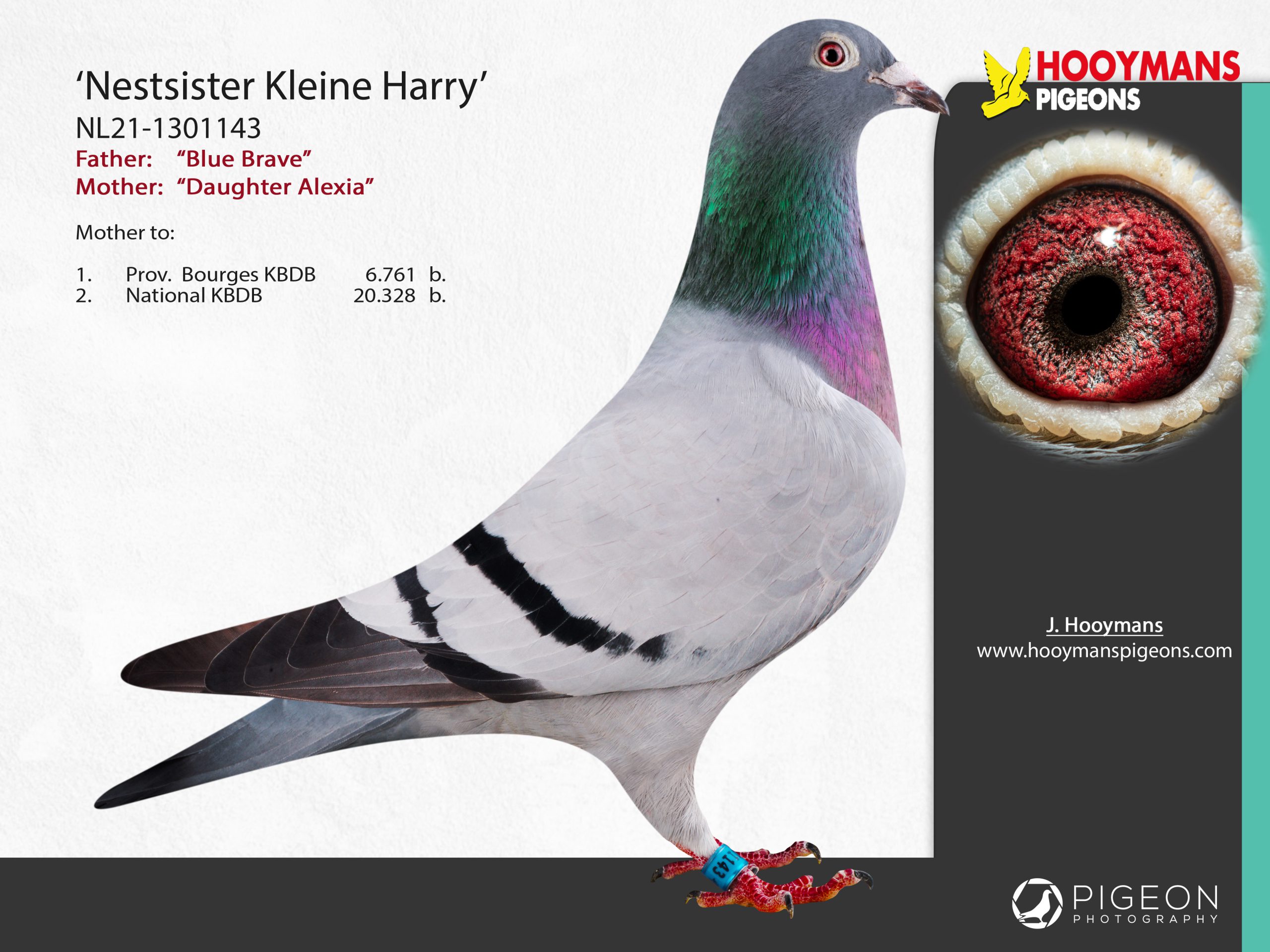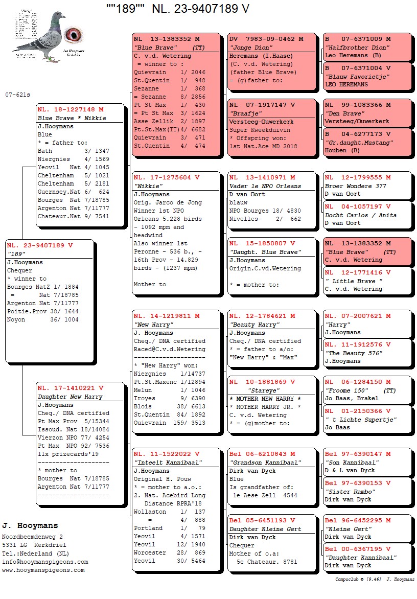 Vader van dit kanon is de NL18/148, een ingeteelde zoon “Blue Brave” (alweer!). Blue Brave met “Nikkie”, dat is zijn kleindochter die zelf de 1e NPO Orleans won bij Jarco de Jong. De NL18/148 geeft top10 Nationaal noteringen in zowel België, Nederland als Engeland. Moeder van de 7e Nationaal is de NL17/221 Dochter New Harry. Zij heeft in Kerkdriel gevlogen en won onder meer een 5e Provinciaal Pont St. Maxence tegen meer dan 15.000 duiven.