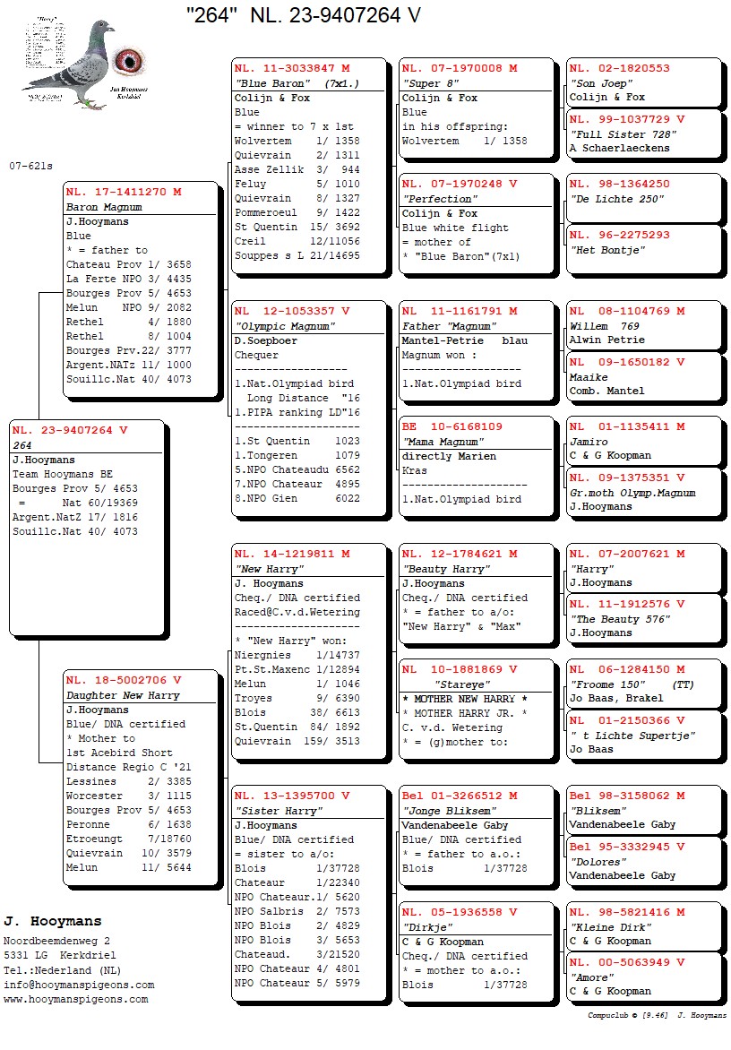 De eerste jaarling (NL23/264, 2e getekende) is opnieuw een kleinkind van “New Harry”. De eerste oude (NL22/103) is een kleinkind van Harry. Zowel de eerste oude als eerste jaarling zijn ook kleinkind van “Blue Baron”, een supervlieger die we verkregen via Peter Colijn uit Nieuwendijk en die o.a. de 1e NPO Bourges bij ons kweekte.