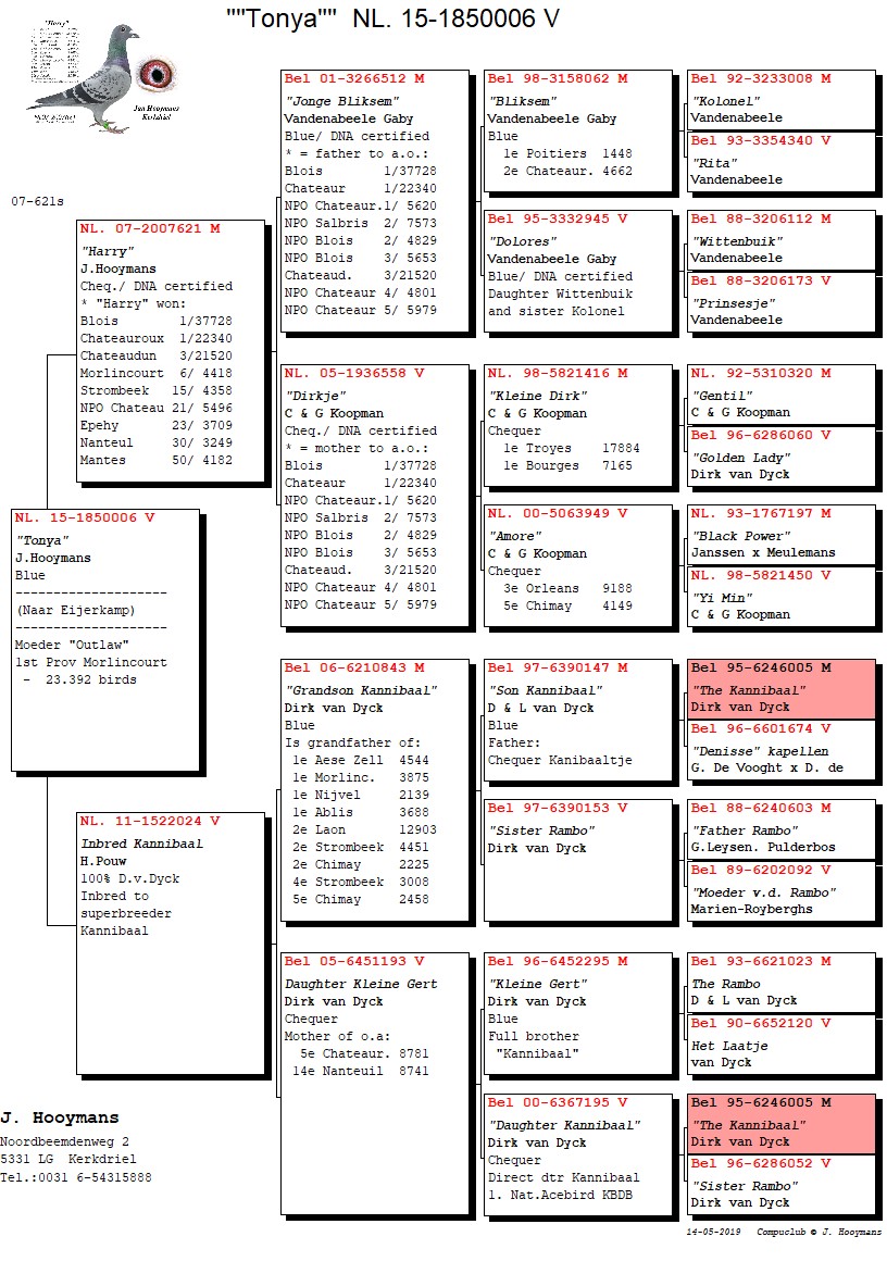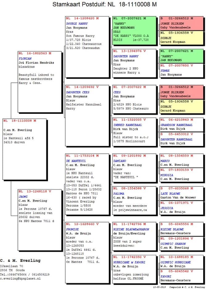 我们也收到了来自凡奥斯战队的捷报,他们鸽舍成绩最佳的2羽赛鸽均出自胡曼斯原舍鸽。瑞恩(Rien),厄文(Irving),艾力克(Erik)和迪尼(Diny)近年来一直在努力工作,我们的胡曼斯鸽在其中发挥了重要作用,我们为此而感到非常的自豪。全省亚军出自“哈利”直女,全省8位的母亲出自“哈利兄弟”X“哈里特”(Harriette,彼得.纳特,NPO摩林科冠军,“哈利”孙女)。